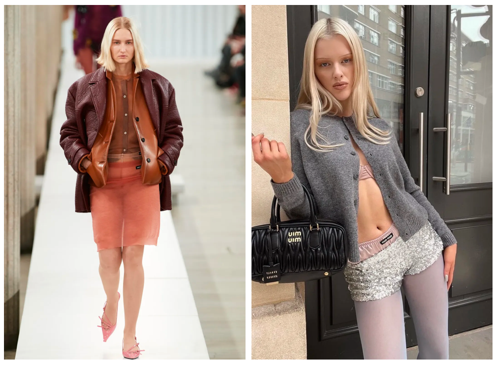 在穿搭时只需隐约露出带有logo缀饰的真丝内裤边,时髦度立即翻倍,Miu Miu依旧很懂社交媒体的流行公式。