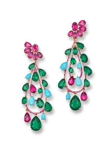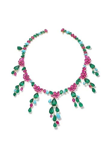 这一系列的鸡尾酒戒指从祖母绿的中心向邻近的手指呈扇形展开,搭配着水滴形宝石花瓣,形成一朵绚丽夺目的花朵。耳环的梨形祖母绿、红碧玺和绿松石宛如如珍珠吊灯上的水滴悬挂,与项链上相同切工的彩色宝石形成的流苏形状遥相呼应。