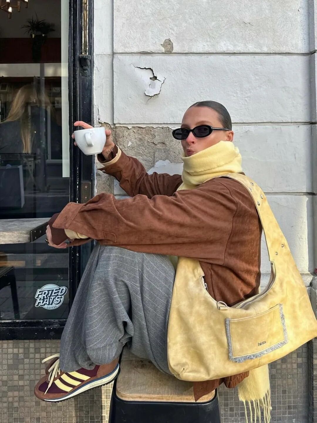 摩卡棕与黄色的组合视觉舒适度满分,饱和度低一些的黄色更显高级。一整套Look上身,既不过于张扬,又不会存在感太低,给人一种和谐且富有层次的感官效果,围巾、包包之类的单品也可以成为点睛之笔。