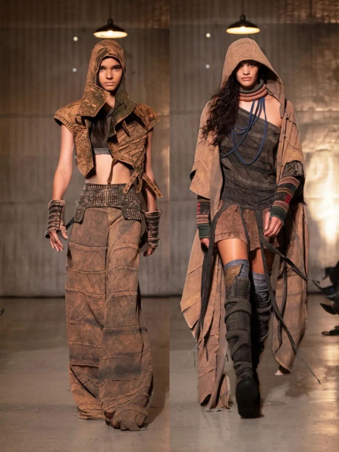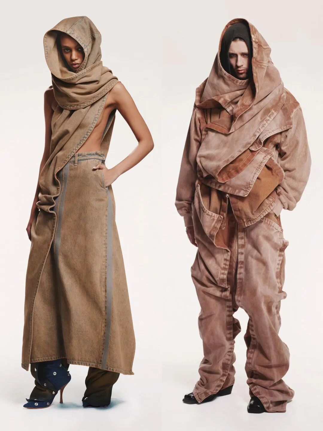 废土风品牌Demobaza运用不同低饱和色调和面料材质呼应不同场景下的废土环境,呈现末日沙丘的破败美学。