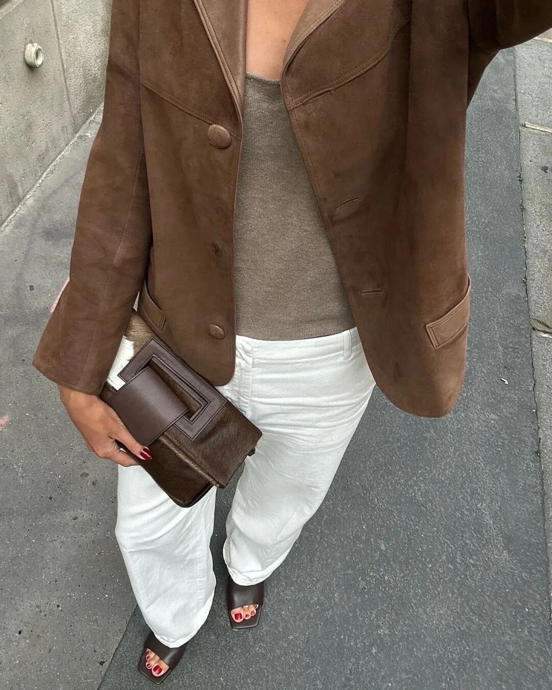 摩卡棕和白色是最容易驾驭的一组配色,不管是作为内搭还是下装出现,都显得干净利落,有效地中和了棕色可能带来的沉闷感,秋冬季节更有暖乎乎的感觉。