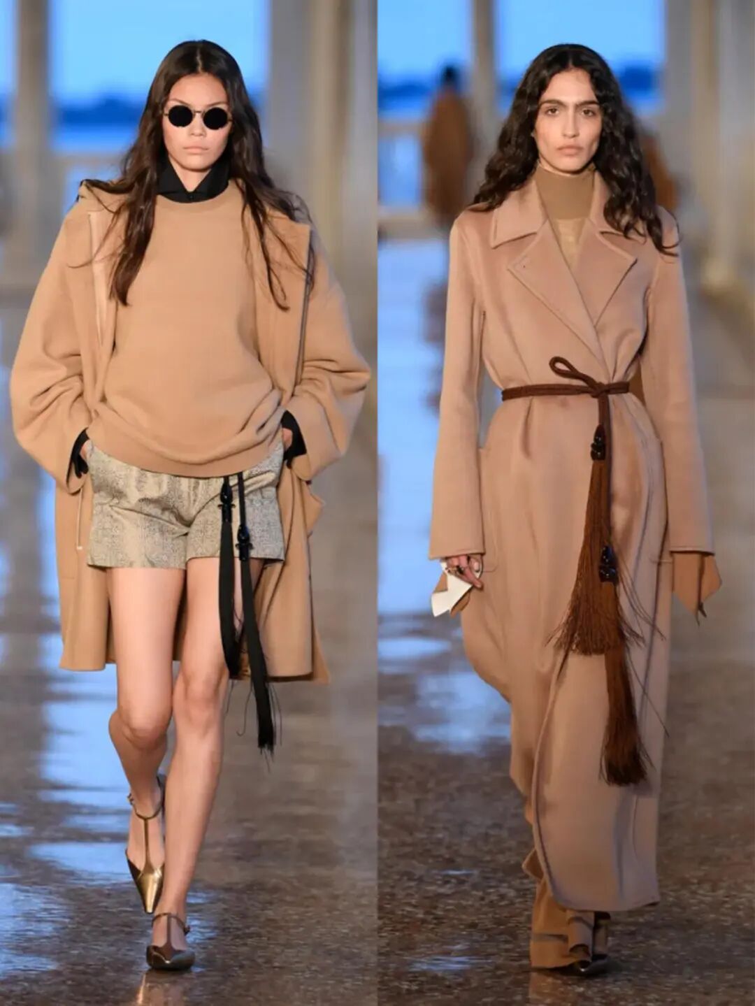 Max Mara作为以驼色大衣闻名的品牌,2025早春系列以“丝绸之路”为灵感,以大地色系为主色调,搭配具有东方韵味的流苏腰带,尽显女性优雅与大气。