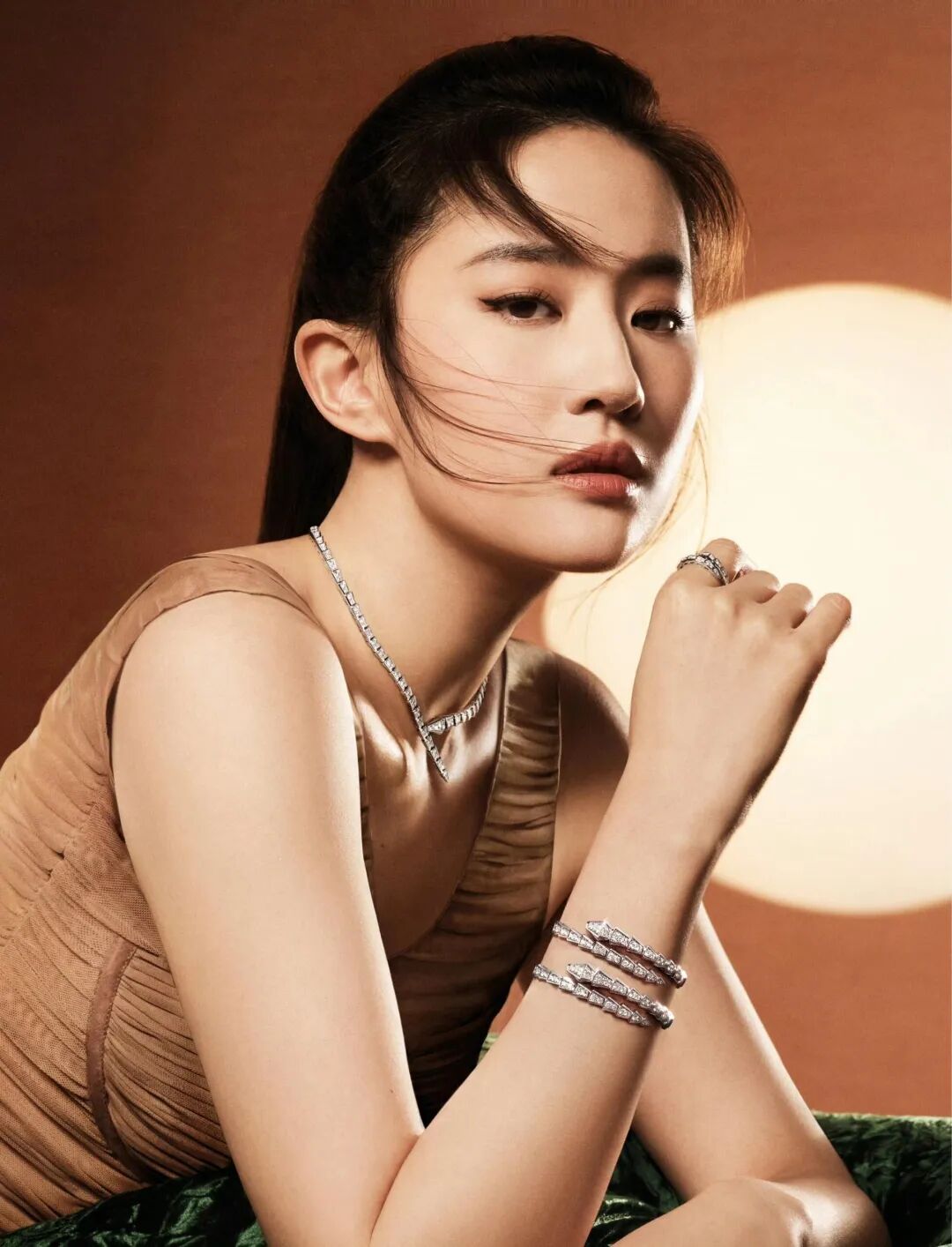 在宝格丽Serpenti系列品牌大片中,刘亦菲身穿摩卡棕色连衣裙,束着利落马尾,神情坚定,尽显女性蓬勃力量与自信之美。