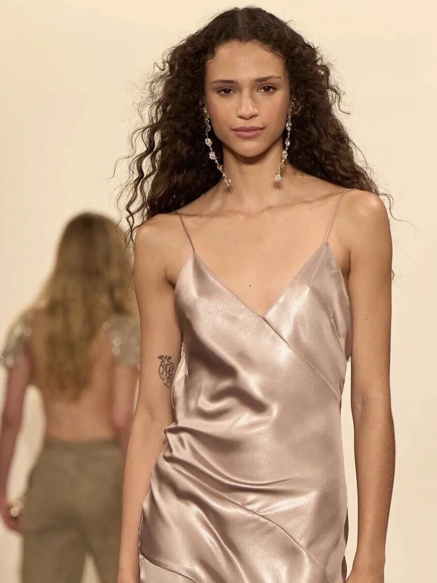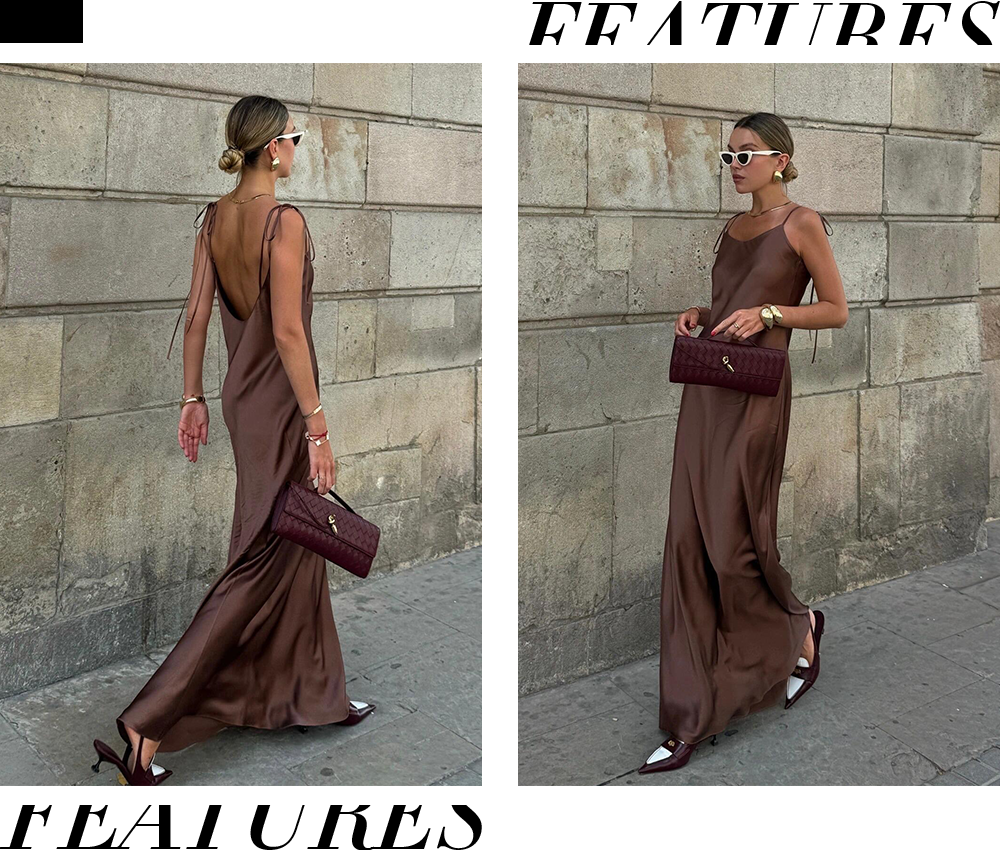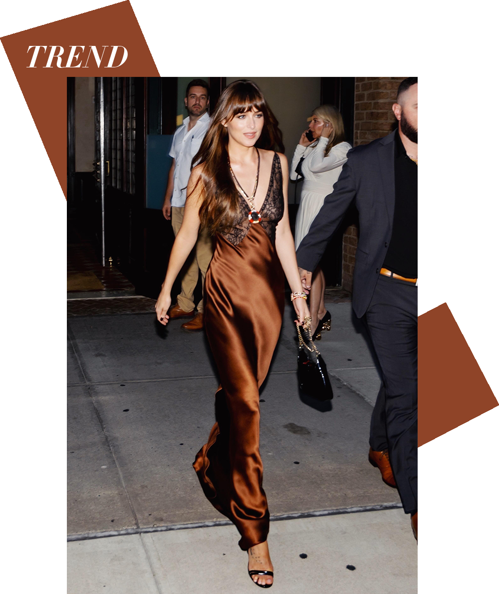 缎面单品对于棕色系穿搭来说,是随时能为美貌补光的“最强buff”。达妹一头随意披下的棕色秀发、身上巧克力棕的缎面长裙在夜色中闪闪发光,不需要太过耀眼的华服就已经足够吸引人。