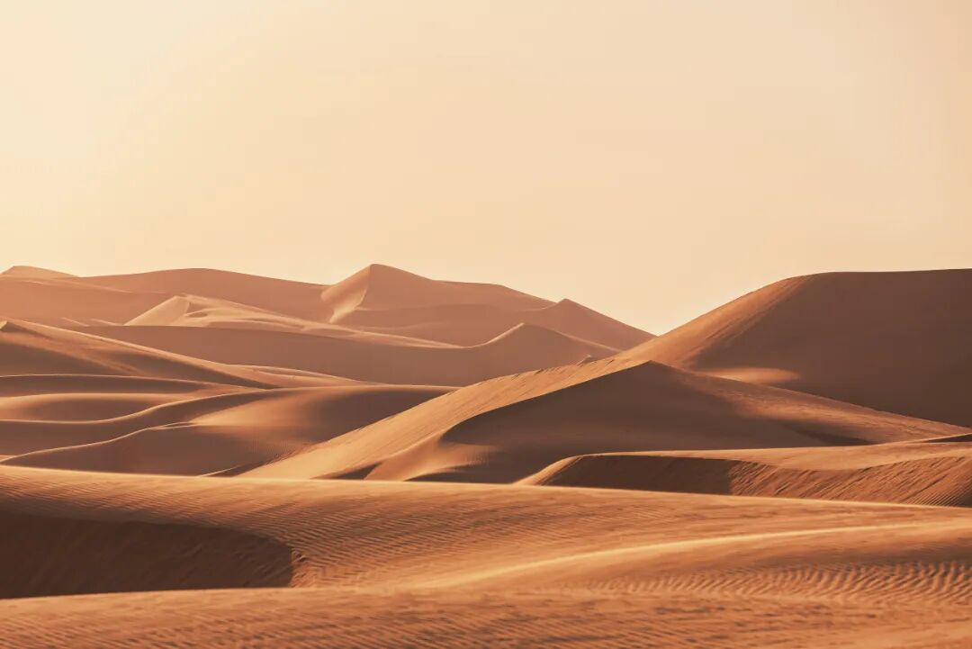 或是在沙漠的黄昏时刻,太阳的余晖将沙丘染成一片暖棕色,光影在沙丘的纹理间流动。