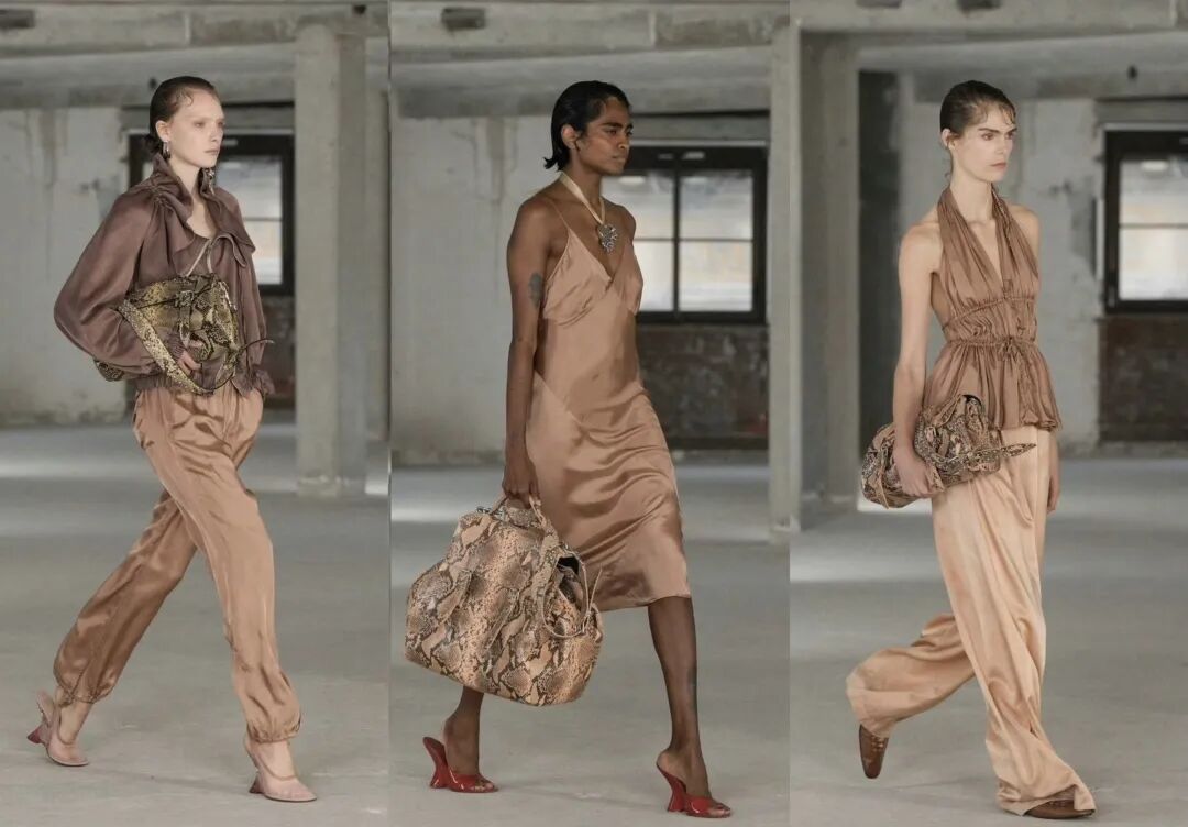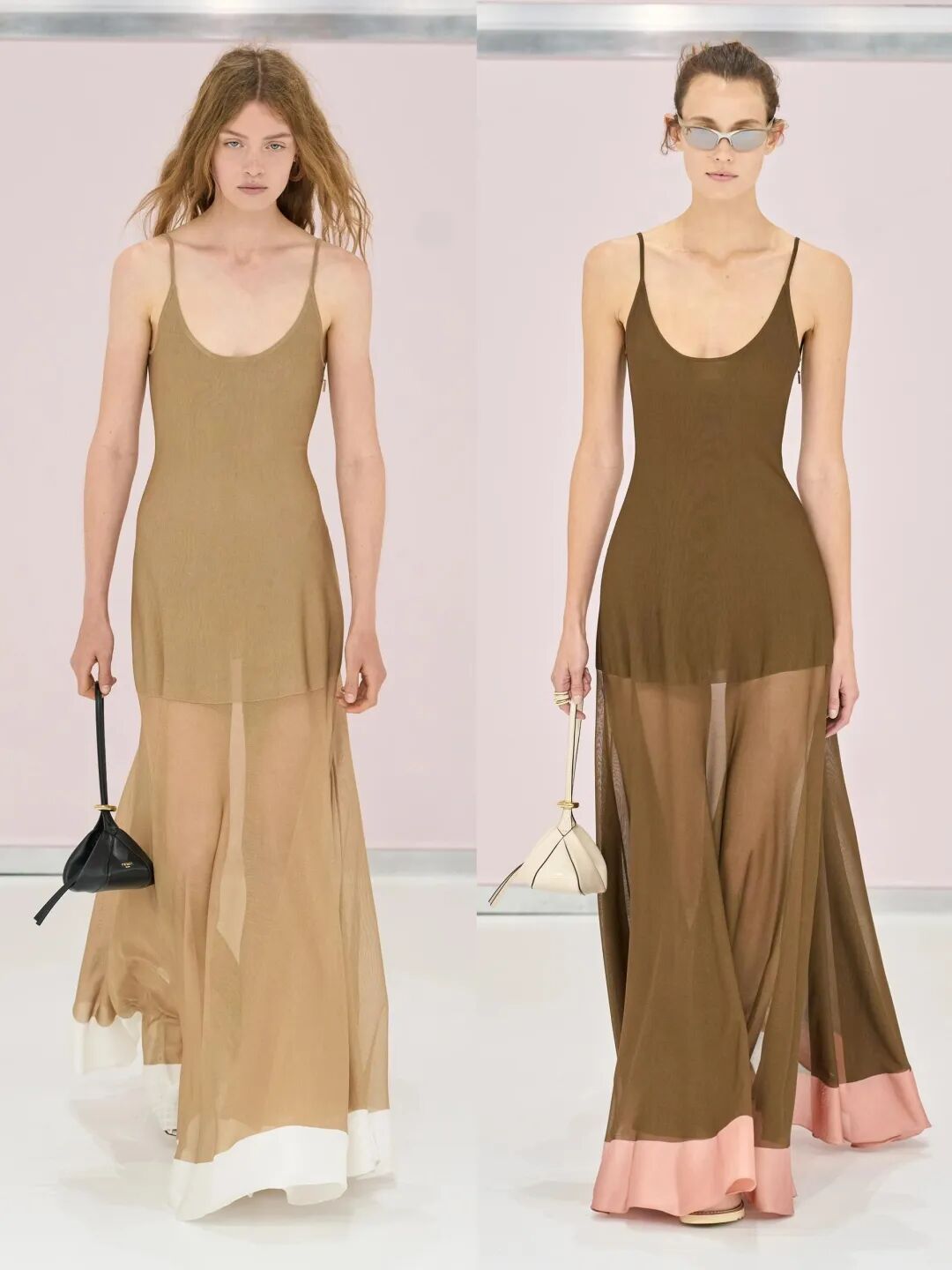 Fendi 2025春夏系列巧妙地运用透视元素,让整体造型高雅性感又不落俗套。深浅各异的棕色在透视的映衬下,或浓郁醇厚,或轻盈柔和,既营造出沉稳内敛的氛围,又增添了几分神秘的气息。