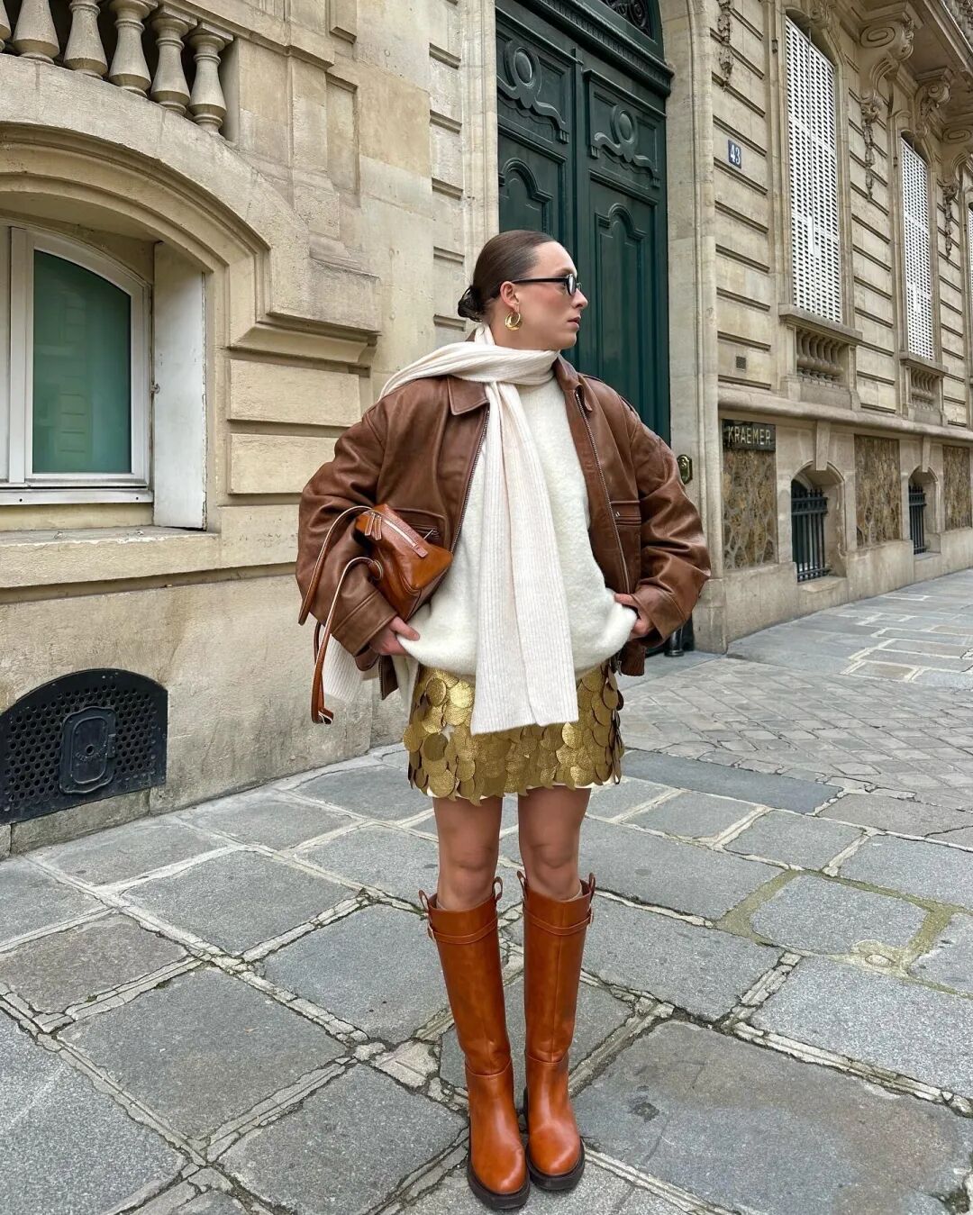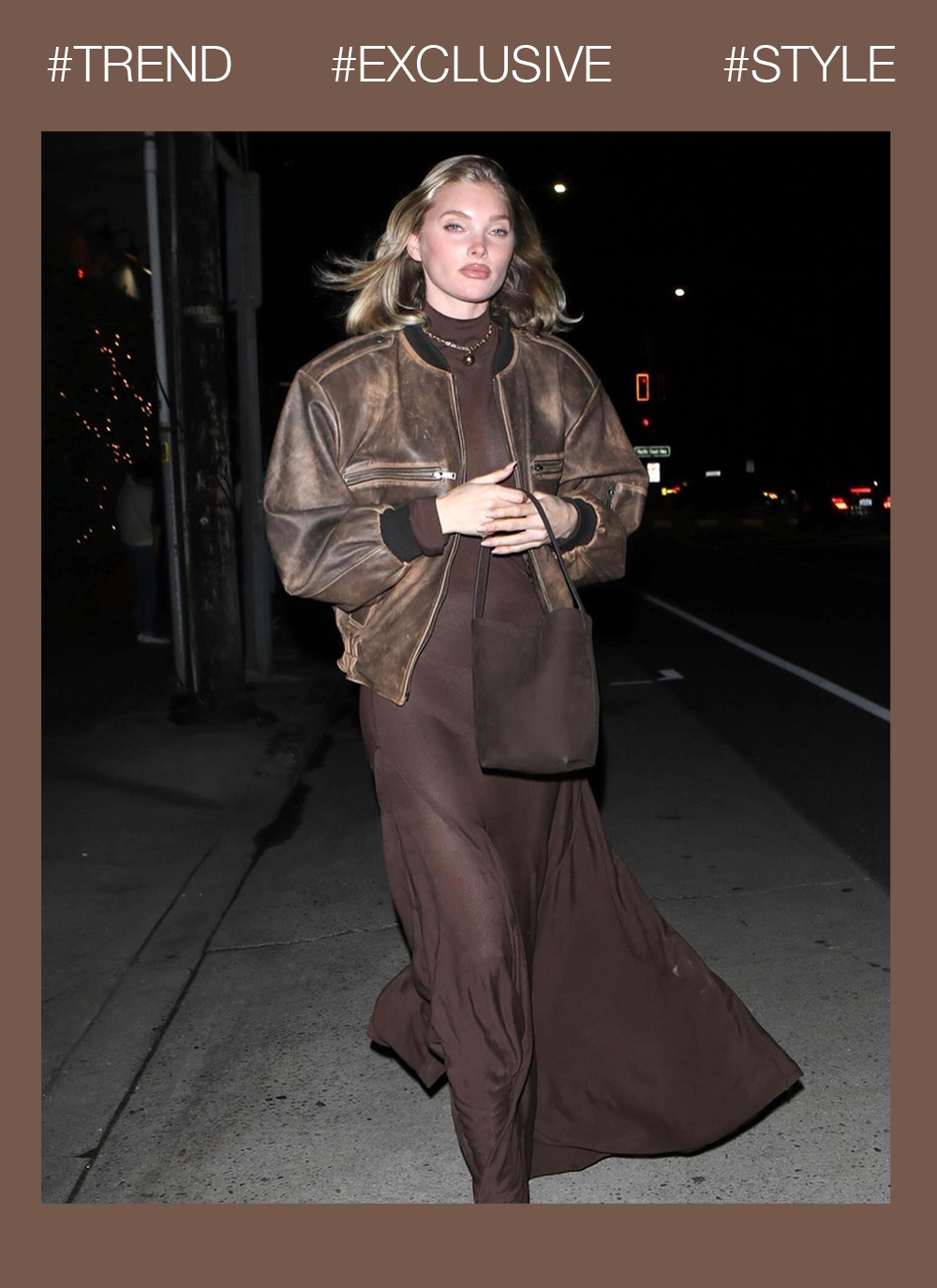 Elsa Hosk用做旧款棕色皮衣外套搭配同色系连衣裙,皮衣外套的硬朗与连衣裙的柔美相互碰撞,独有一种“刚柔并济”的随性风格。