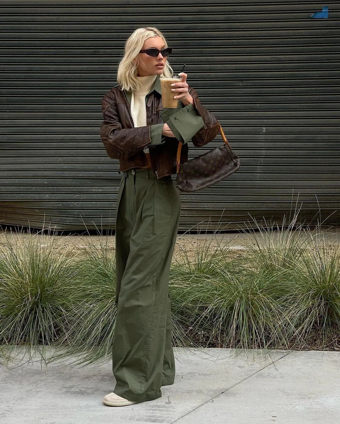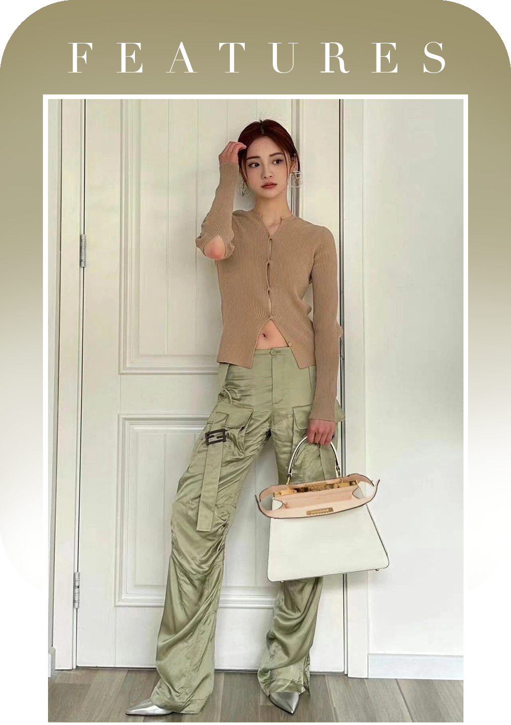 或者像周洁琼这样一套低饱和度的穿搭,浅咖色针织衫搭配抹茶绿缎面工装裤,通过细腻的色彩差异营造出独特的层次感和视觉焦点,在低调中彰显个性。