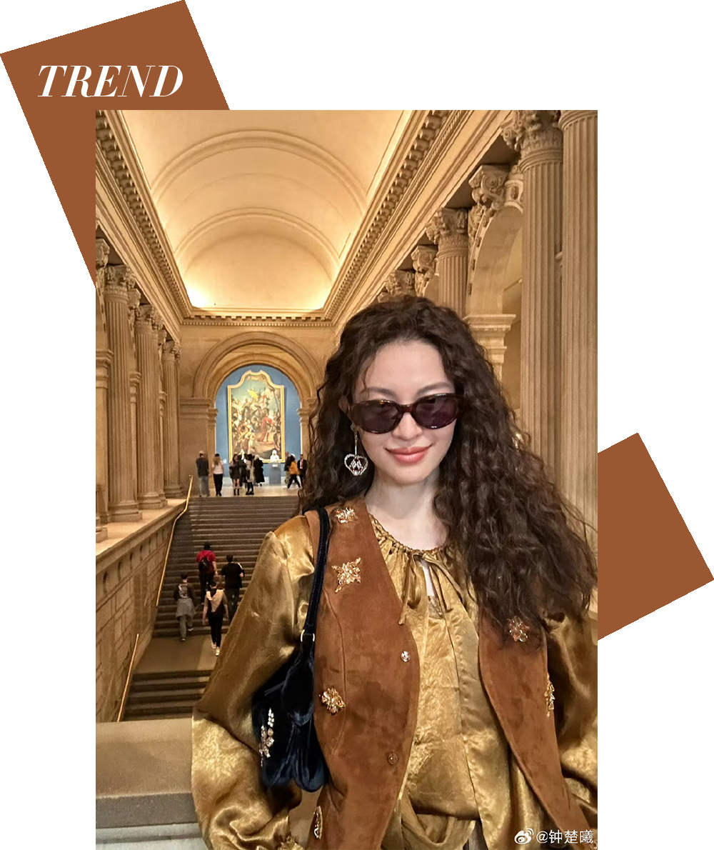 摩卡棕和金色更是相得益彰。钟楚曦的看展look让人眼前一亮,金色内搭叠穿棕色麂皮马甲,兼具棕色的质朴和金色的贵气,营造出独特而富有艺术感的氛围。