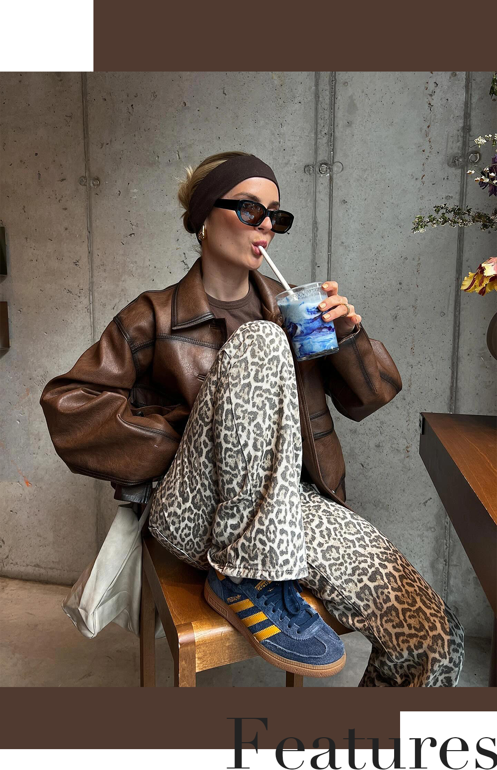 同色系搭配时,为了增添更多的趣味性,可以将搭配重点放在单品的设计感上。棕色皮衣外套搭配豹纹工装裤,既不会破坏造型的整体性,又足够吸睛。