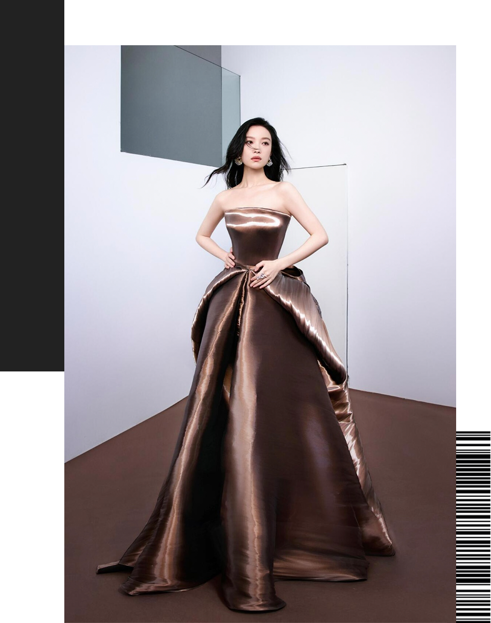 像倪妮这样的淡颜系美人穿咖色更是锦上添花,咖色抹胸礼服泛着光泽,收腰的设计为整体造型增添了一份立体感和层次感,贵气中透着清冷,宛如从古典油画中走出的佳人。