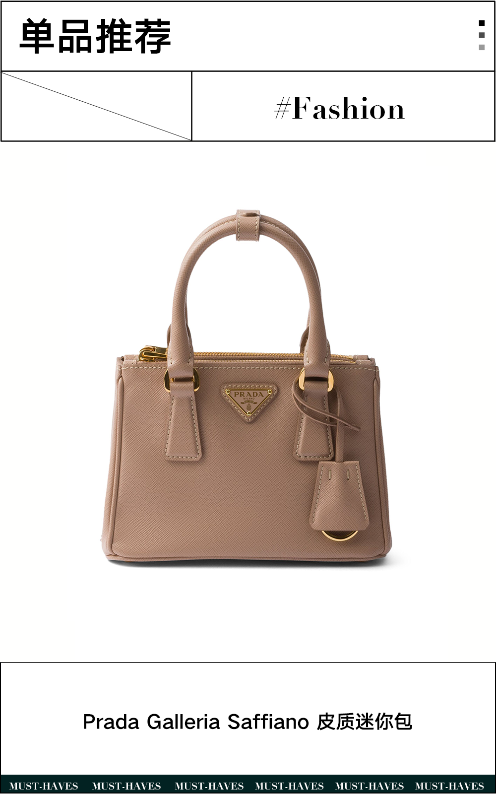 Prada这款包包颜色大气百搭,采用的Saffiano皮革经特殊压纹处理,耐磨防水且质感硬朗,迷你尺寸精致小巧,满足特定小物件携带需求。方正造型与简洁线条搭配经典金属三角标,翻盖按扣开合实用利落。
