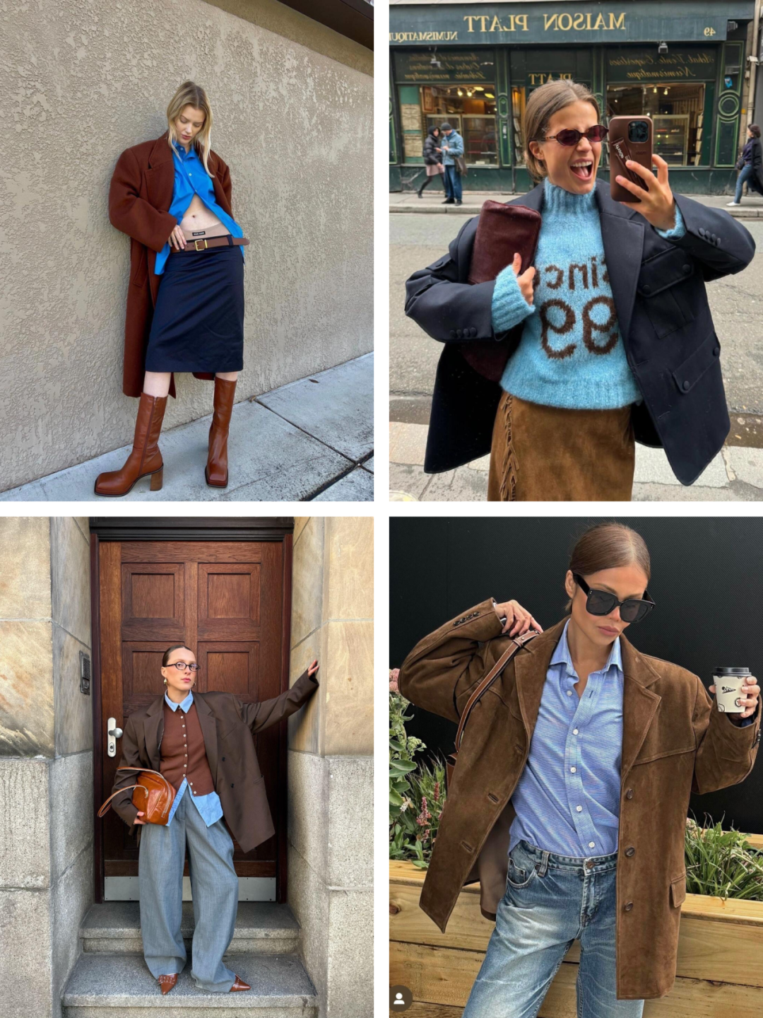 摩卡棕与蓝色的碰撞大胆又充满创意,通常将蓝色作为内搭与棕色叠穿。不同饱和度的蓝色衬衫能形成不同的化学效果,但无一例外地为整体造型增添了一丝复古文艺感。