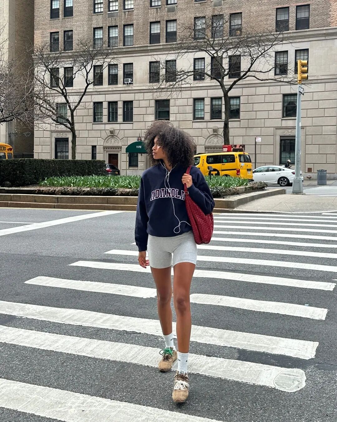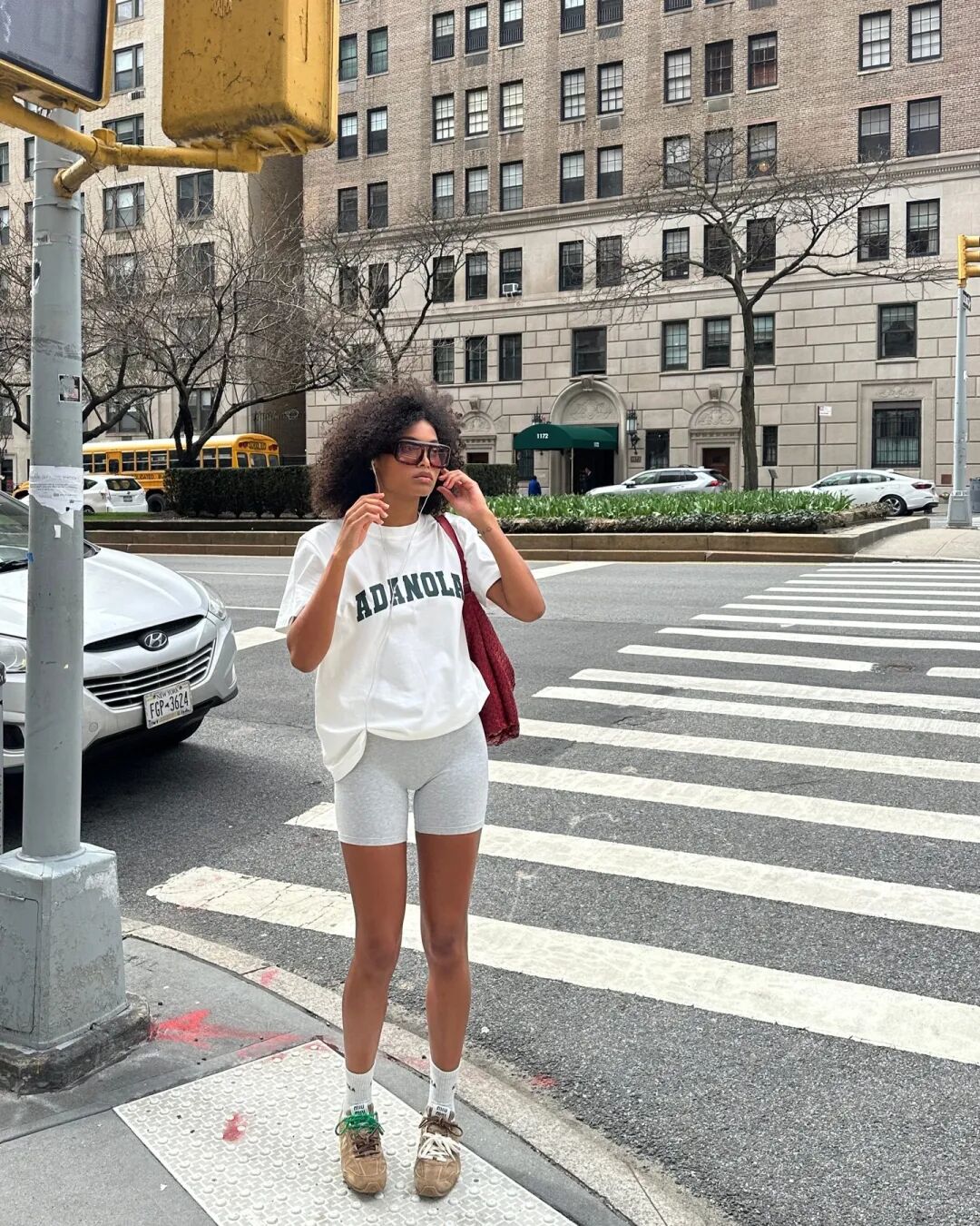 简单的骑行裤,哪怕是随便搭配oversize的卫衣帽衫,也能带起一股轻松不刻意的职场新风格。