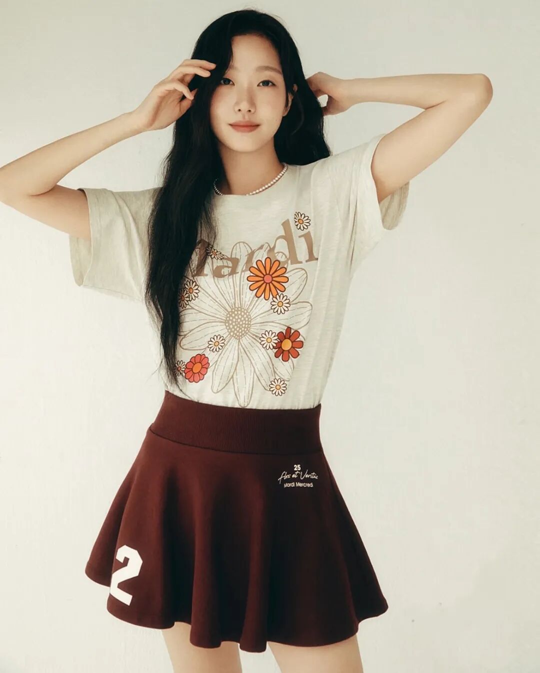 此外,将单品从学院场景中解放出来,混搭同样是打造“学院T”风格的重要方式,就像金高银这身造型,小雏菊T恤配透视蕾丝半裙,厚重棉质与轻盈柔纱的对冲让look瞬间显得大不一样。