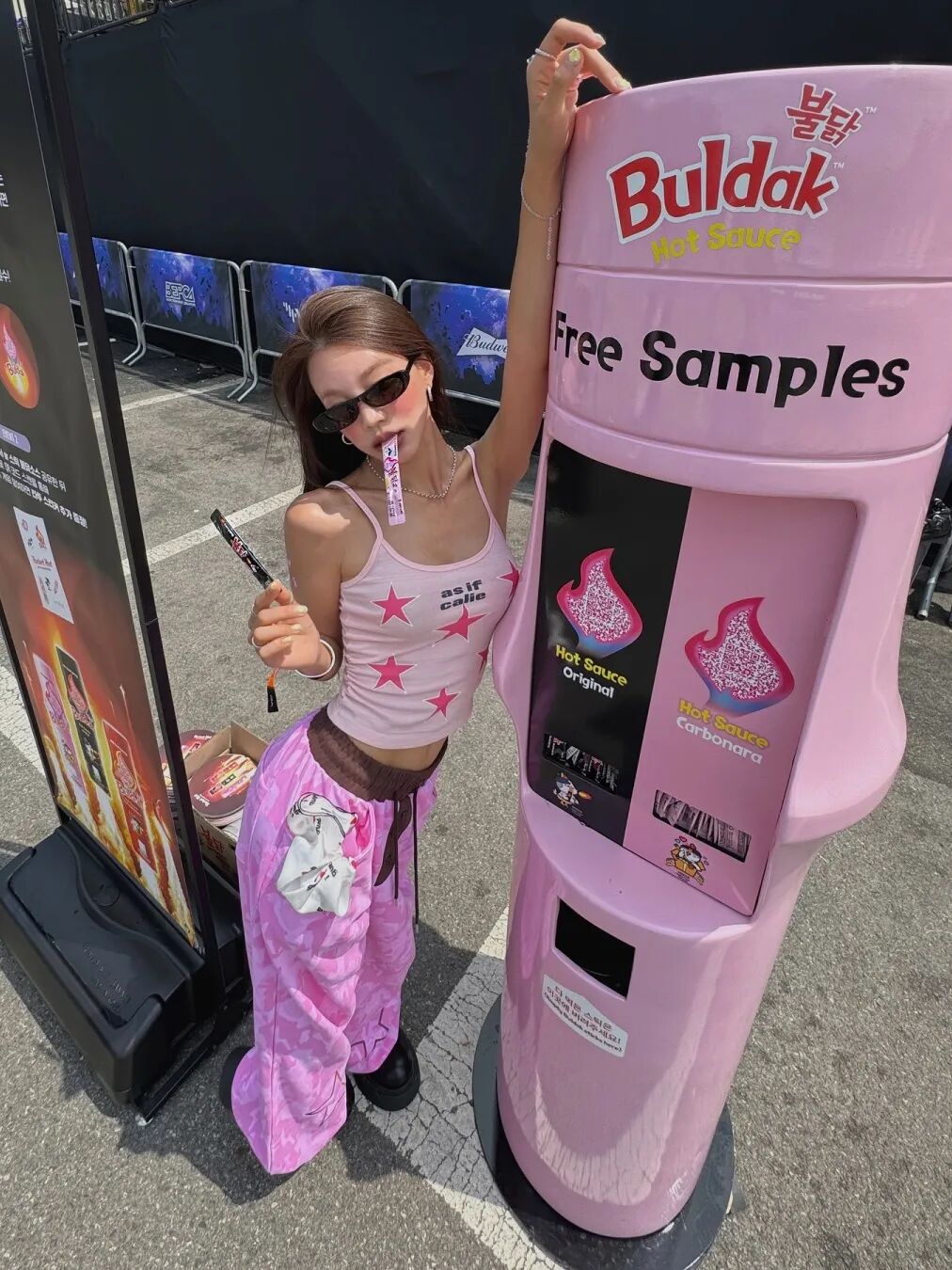 翻看千禧年间流行的甜辣Y2K风格照片,不难发现,荧光色和露肤度高的单品是关键,艳丽眼影搭配吊带和低腰喇叭裤,恰好是一次绝佳的辣妹风格复现。