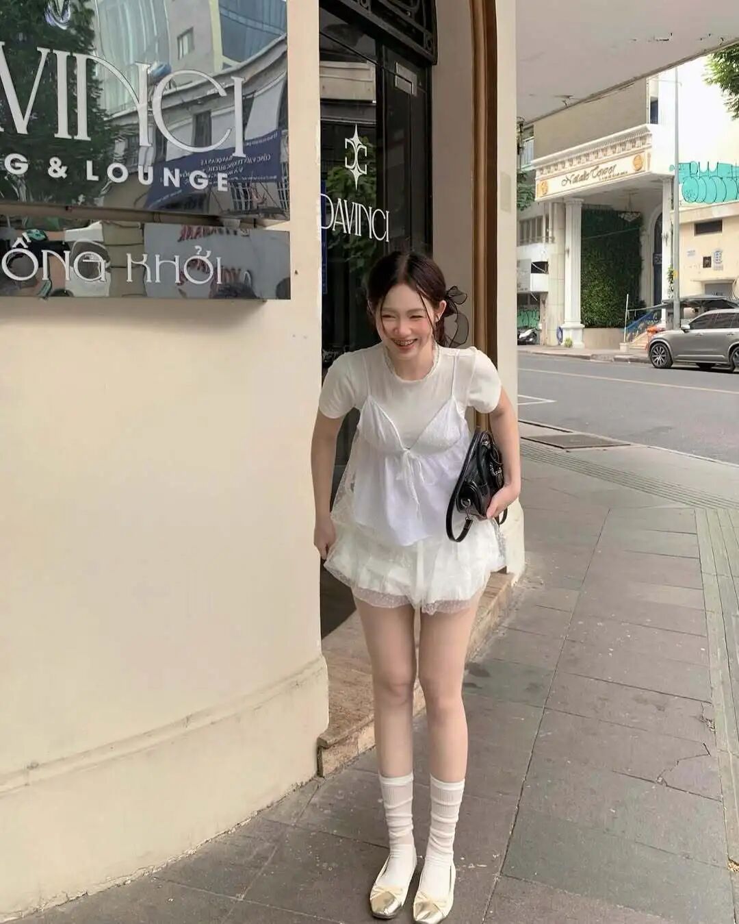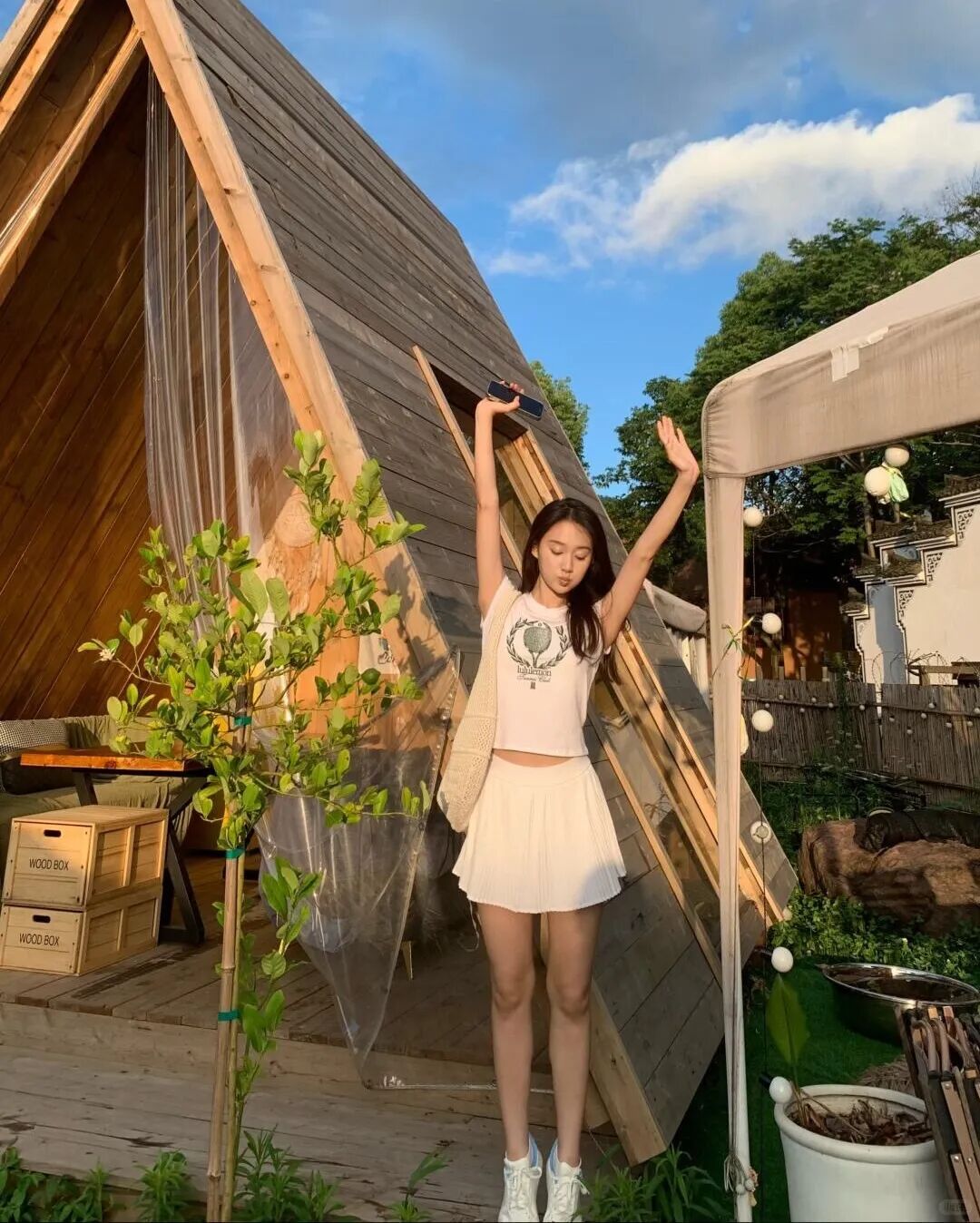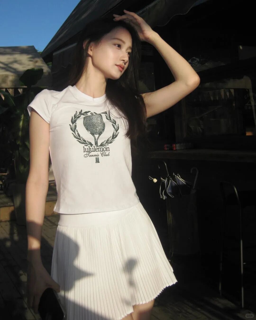 如果想要搭配的风格更多,白色半身裙是个不错的选择。夏梦一身白色造型清新又活力,“tenniscore”近两年备受时髦精们喜爱,她将风琴褶高腰网球裙搭配短款T恤,兼顾舒适与优雅,还有一种将生命力融入到生活方式中的感觉。