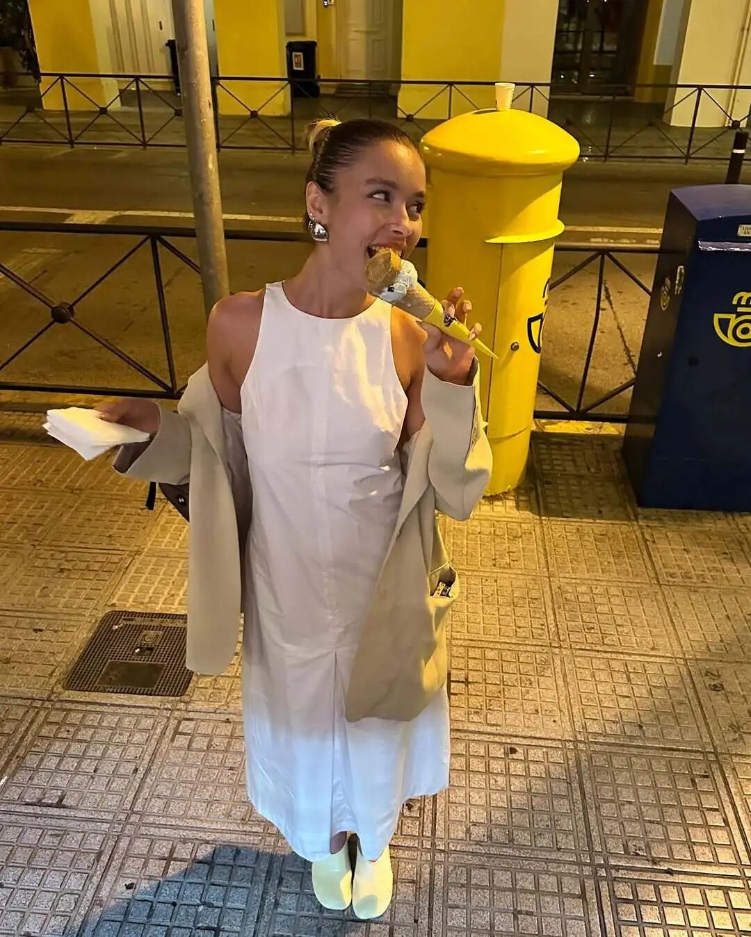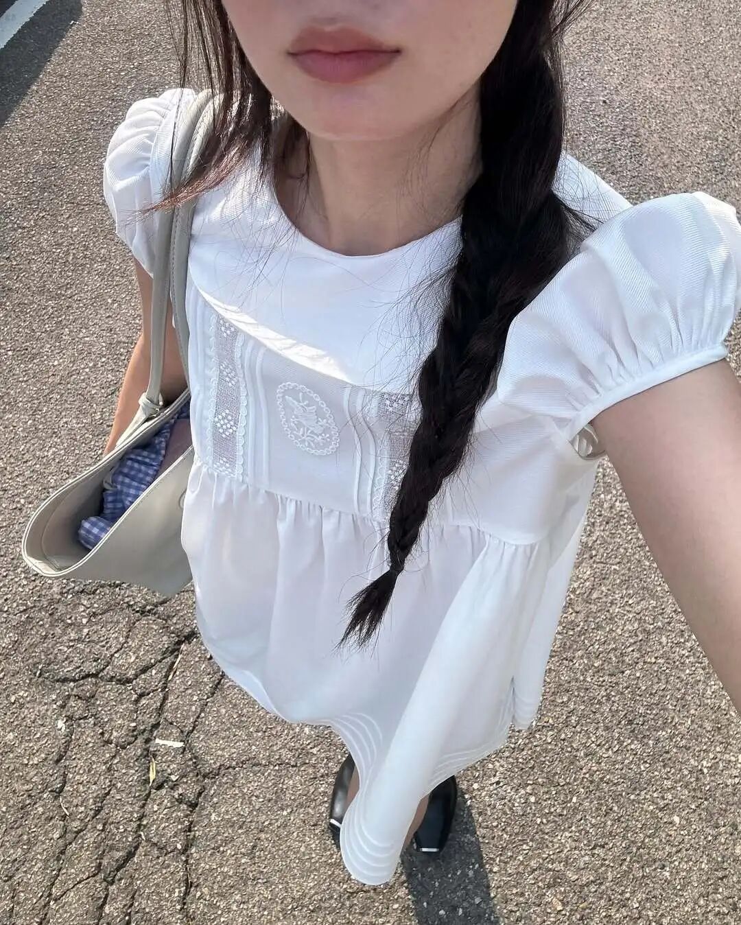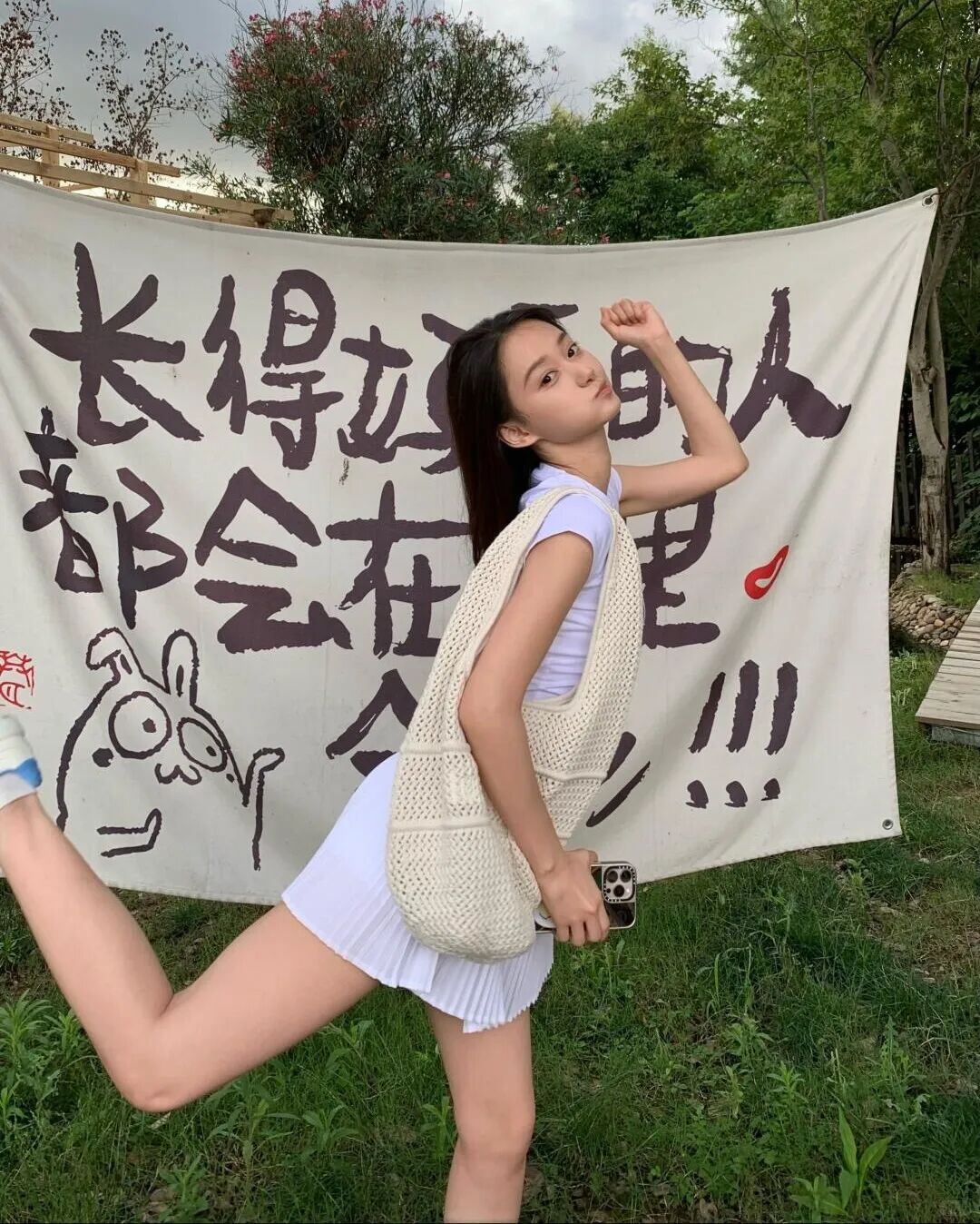 如果想要搭配的风格更多,白色半身裙是个不错的选择。夏梦一身白色造型清新又活力,“tenniscore”近两年备受时髦精们喜爱,她将风琴褶高腰网球裙搭配短款T恤,兼顾舒适与优雅,还有一种将生命力融入到生活方式中的感觉。