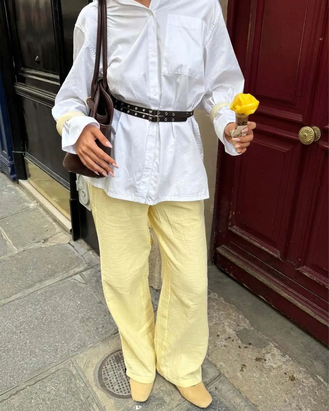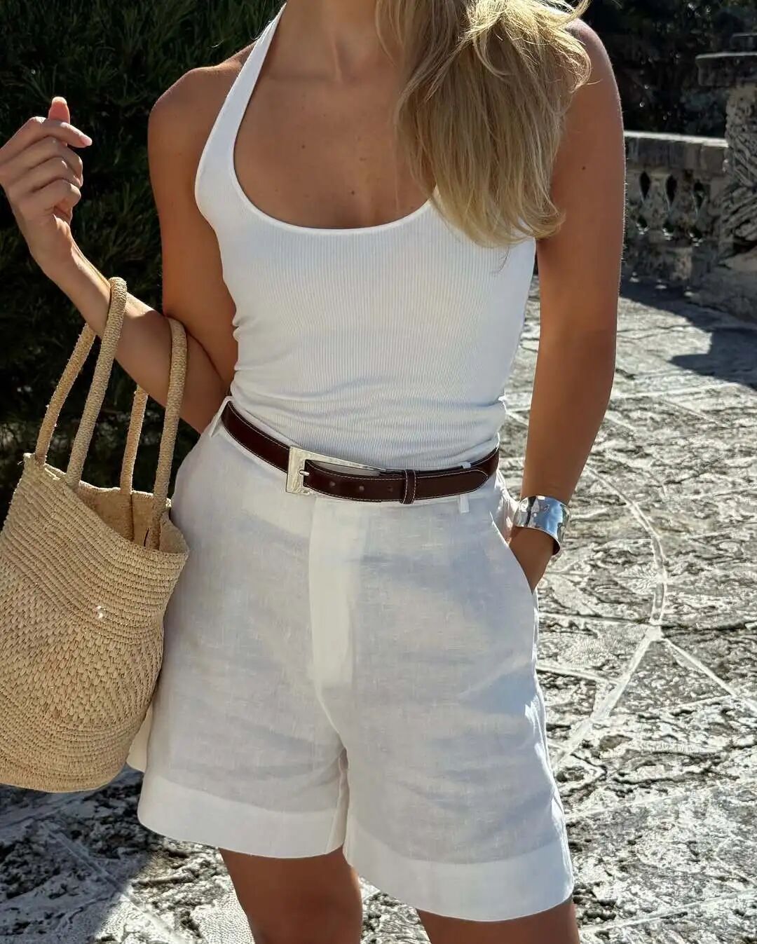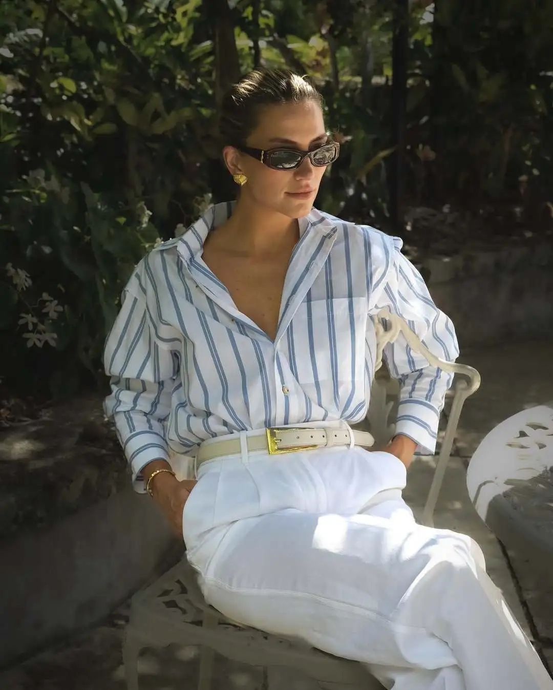 想要度假味更浓,搭配上可以尽量轻松一些——比如可以搭配同色系运动休闲鞋和编织单肩包,组合在一起,有点现在社交平台上“Staycation”的意思了!