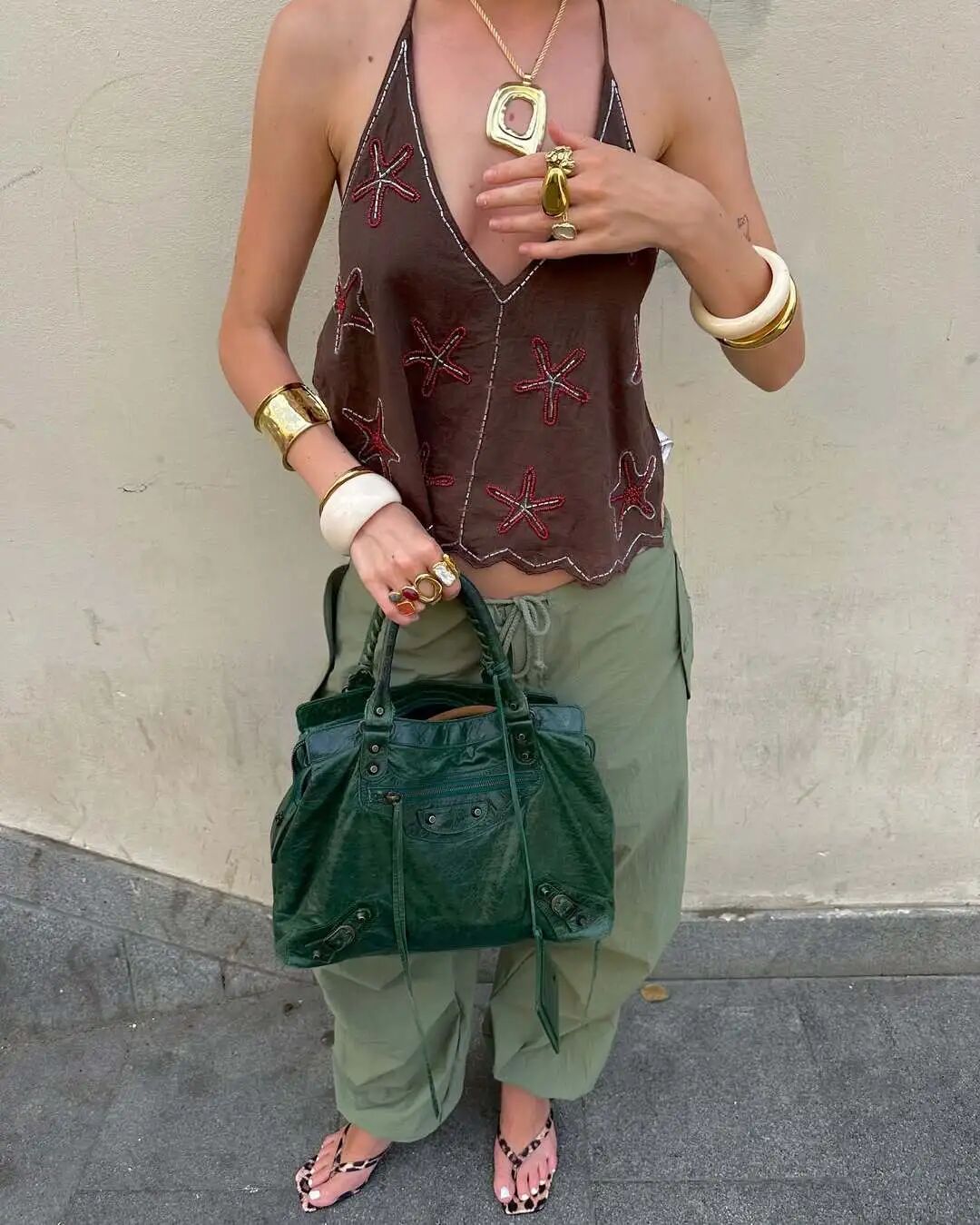 工装裤表面看起来是质朴的日常单品,“私底下”却自带一种探险家的野性浪漫,如果你的目的地是都市或者户外,可以选择带一件它。与丝质吊带的组合更是将刚柔并济的发挥极致,材质对比所体现的反差更有时髦质感。