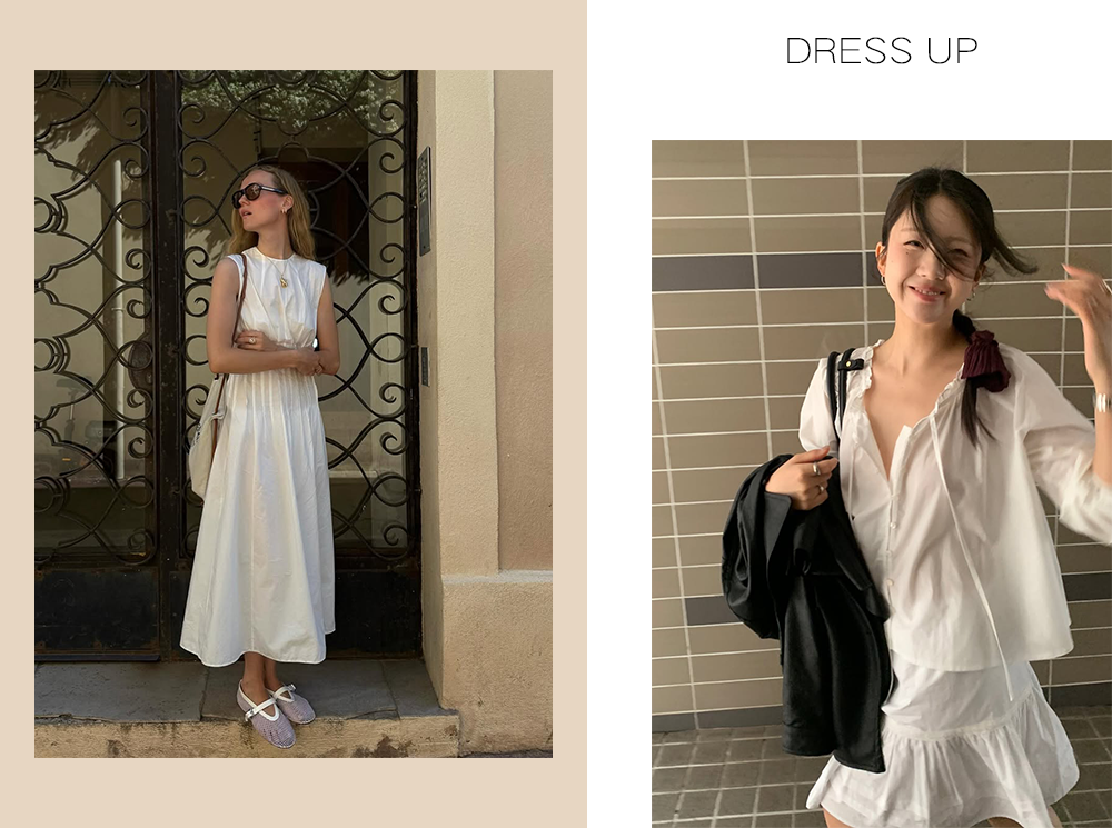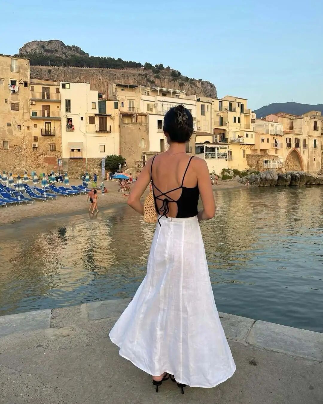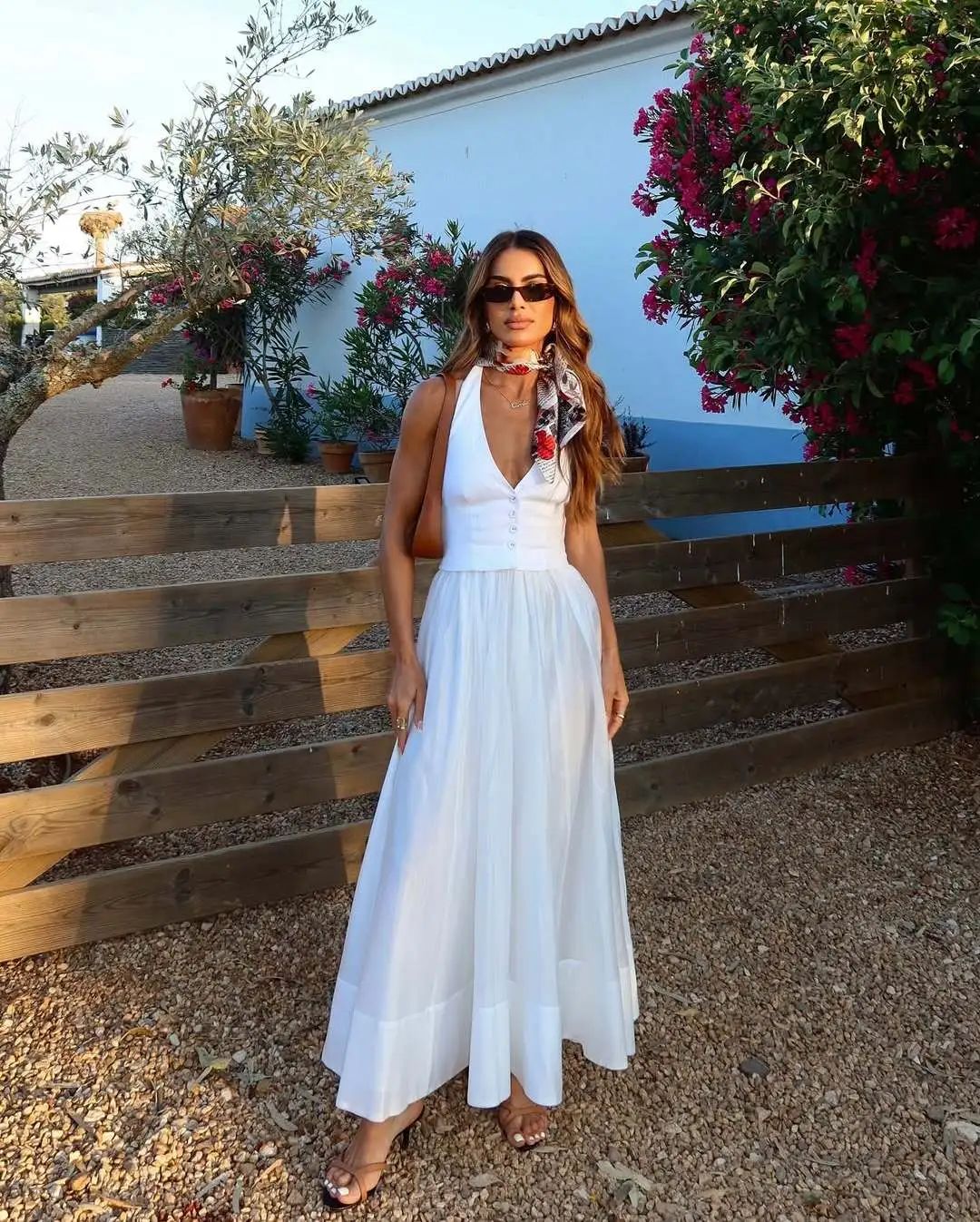 今年“工字”和挂脖式的白色连衣裙相对更热门一些,在保持一定露肤度的同时,它们还可以不那么“绷”着,轻松游玩一整天。