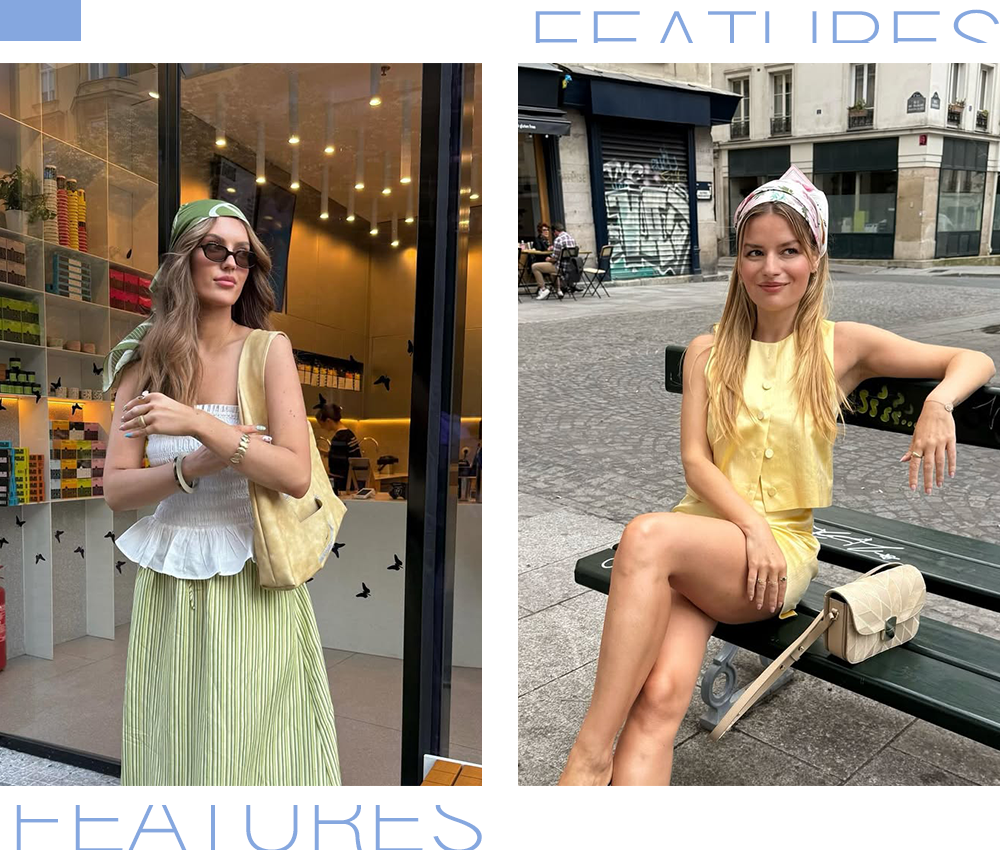 今年的头巾不要太“火”!这条方寸织物能刚刚好地为造型带来轻盈和灵动。头巾的绑法可以根据造型来调整,比如将丝巾在脑后随意打结后自然垂落,呈现一种未完成感的慵懒,或是用衣服的同色系丝巾紧贴发根缠绕,形成建筑感的利落肆意。