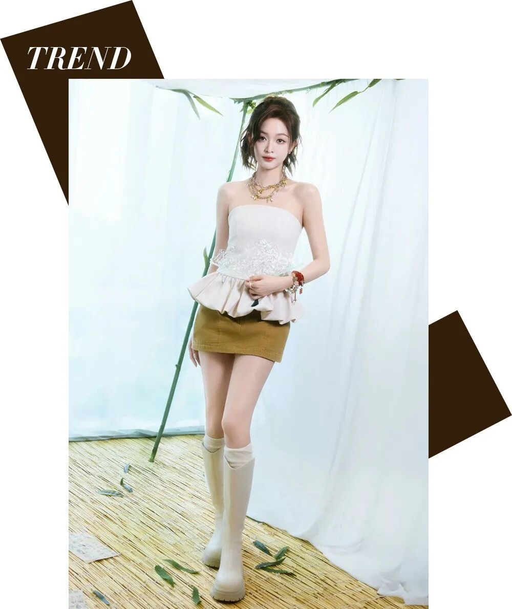 可以让性感和空灵感并存,也是波嬉风独有的特点,适合一些简洁大方,又有俏皮和细节的单品。吴宣仪这件抹胸荷叶裙,强调腰线的同时还增加了穿搭细节,浅米色及膝长靴更是让造型很酷感。
