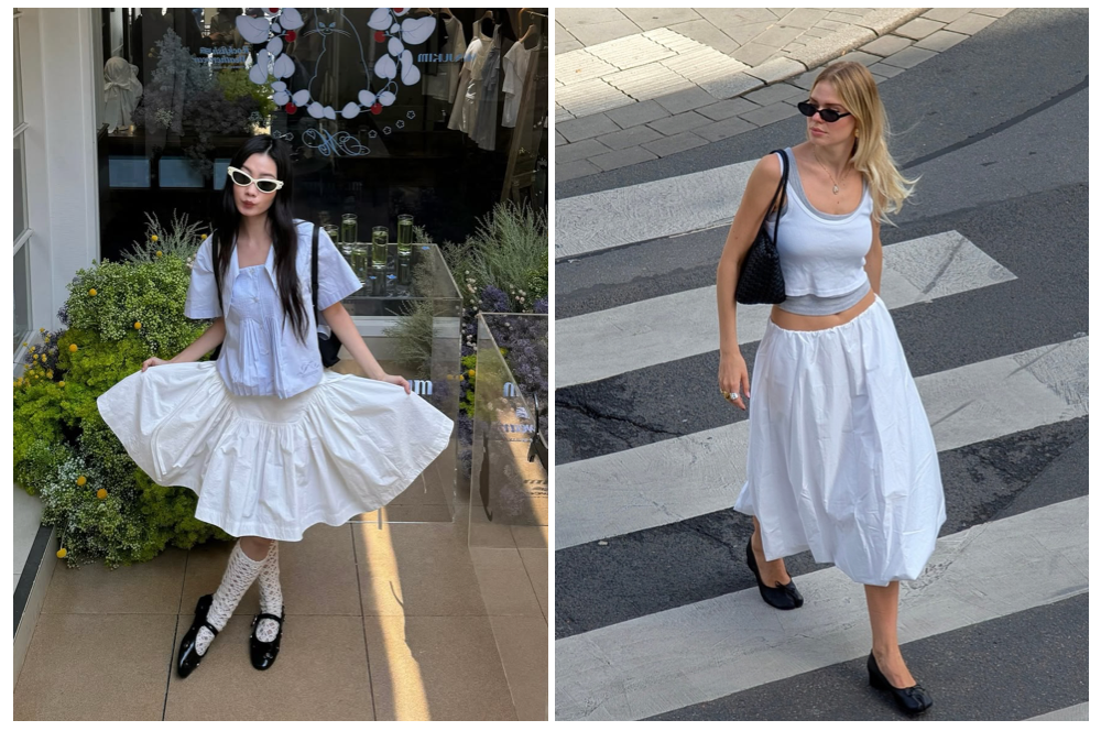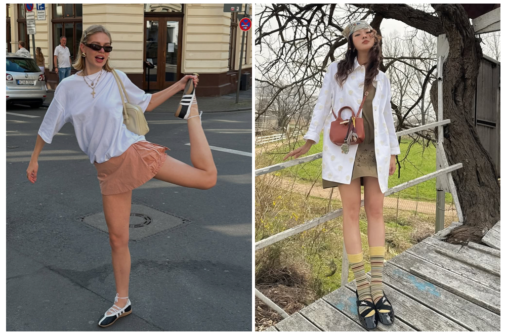 只要有玛丽珍运动鞋的加入,造型都会被增添一种优雅,搭配镂空上衣和中筒袜,视觉上也不会显得割裂,即使是非常日常的穿着,依然有温柔又不甜腻的时髦感。