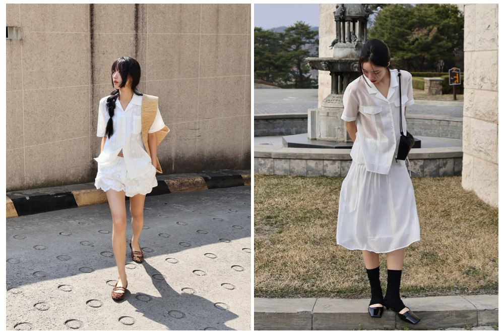 Oversize亚麻和透纱的短袖衬衫,可以解开下边最后的扣子,让衣服自然敞开,搭配一条蕾丝小短裤,或者充满飘逸感的半裙,非常适合想穿出风格感的小个子女生。