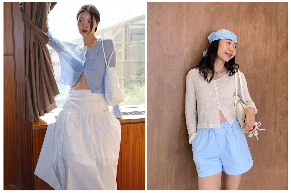 镂空针织小开衫,通过小小的波纹肌理,穿起来有种舒服得恰到好处的自然感,清爽的颜色、简洁的线条廓形,能很好地遮住手臂上的肉肉,让慵懒感加倍。