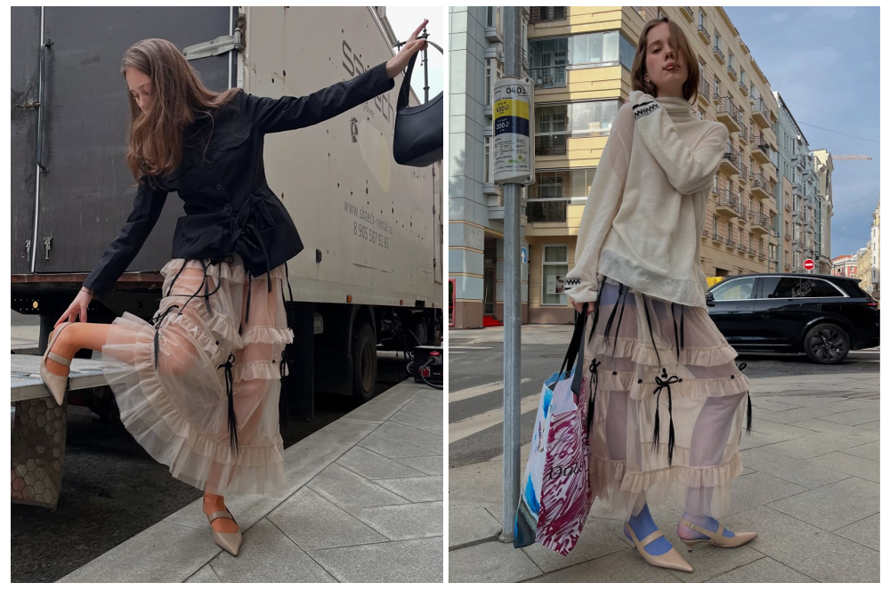 层层叠加的蛋糕裙,视觉冲击感更强,穿起来的感觉也很轻快,轻透的网纱堆叠出立体蛋糕的既视感,还可以用彩色的丝袜作为裙子内的搭配,打造更有态度的造型。