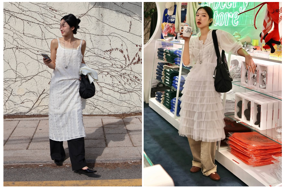 雪纺长裙叠加长裤,修身的长裙褶皱给足了裤身容量,内搭阔腿长裤和平底鞋,选择裤脚走线整齐顺直的款式,腰间也可以系薄针织当腰带,外层透,内层垂,层次再多也不显臃肿。