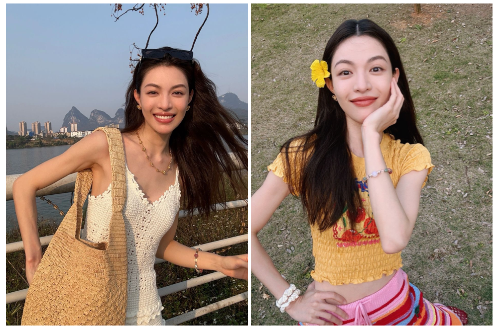 类似褶皱的肌理感款式,也非常讨喜,钟楚曦就很钟爱这种短袖和背心,简单的纯色更多了一些活泼和妩媚,在清新的基调中融进了一丝更可爱。