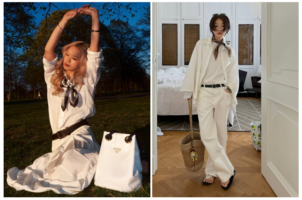 带有毛边设计的T恤衫,这种精心设计的“不完美”,反而比规整设计更戳少女心,而丝巾一眼便具有法式风格的辨识度,丝巾缠绕在脖颈间,让整个造型轮廓休闲又松弛。