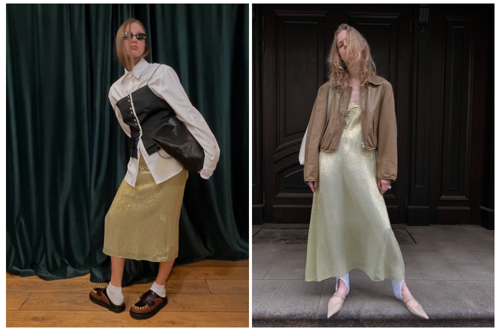 宽松但不松垮的鎏金色A字形半裙,更容易穿出简约却有风格的气质,璀璨的裙装,走动时泛起粼粼波光,上身立刻修饰腿形,酷飒和甜美的风格,也都能轻松被驾驭。