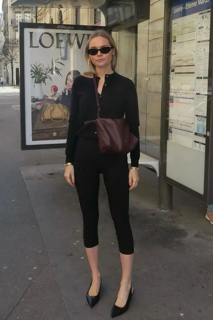 时尚博主Camille Charriere身穿Ferragamo黑色套装,七分裤对于小腿的留白增添了时髦度。