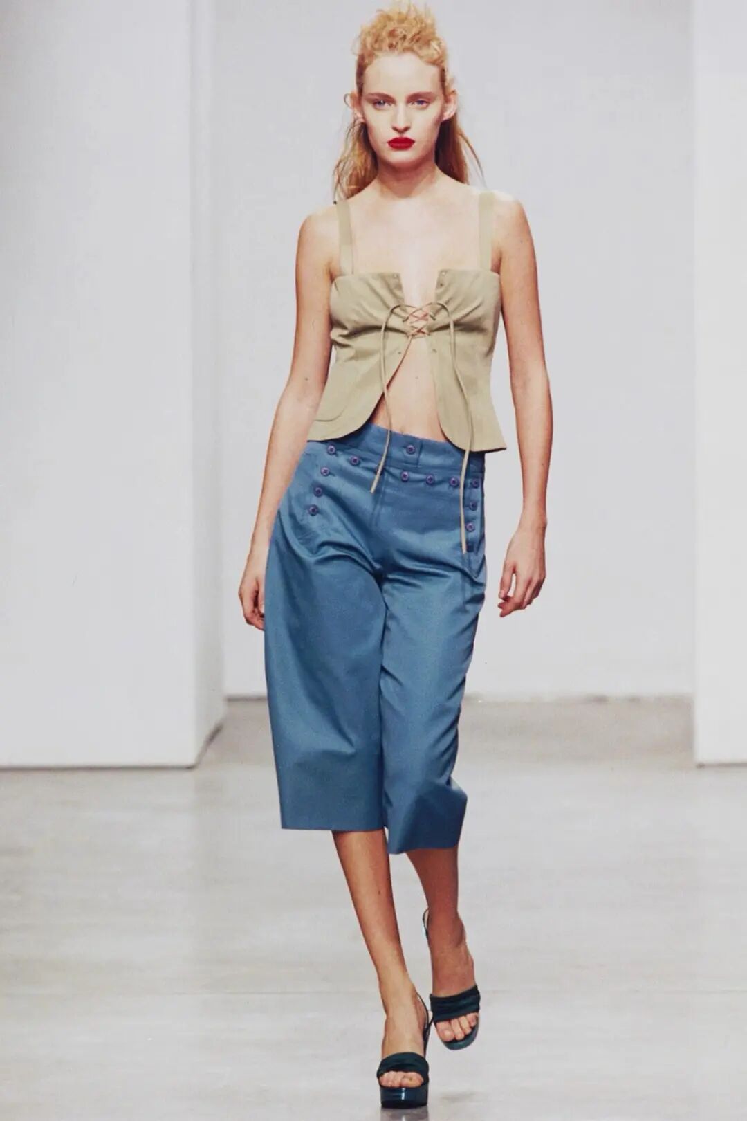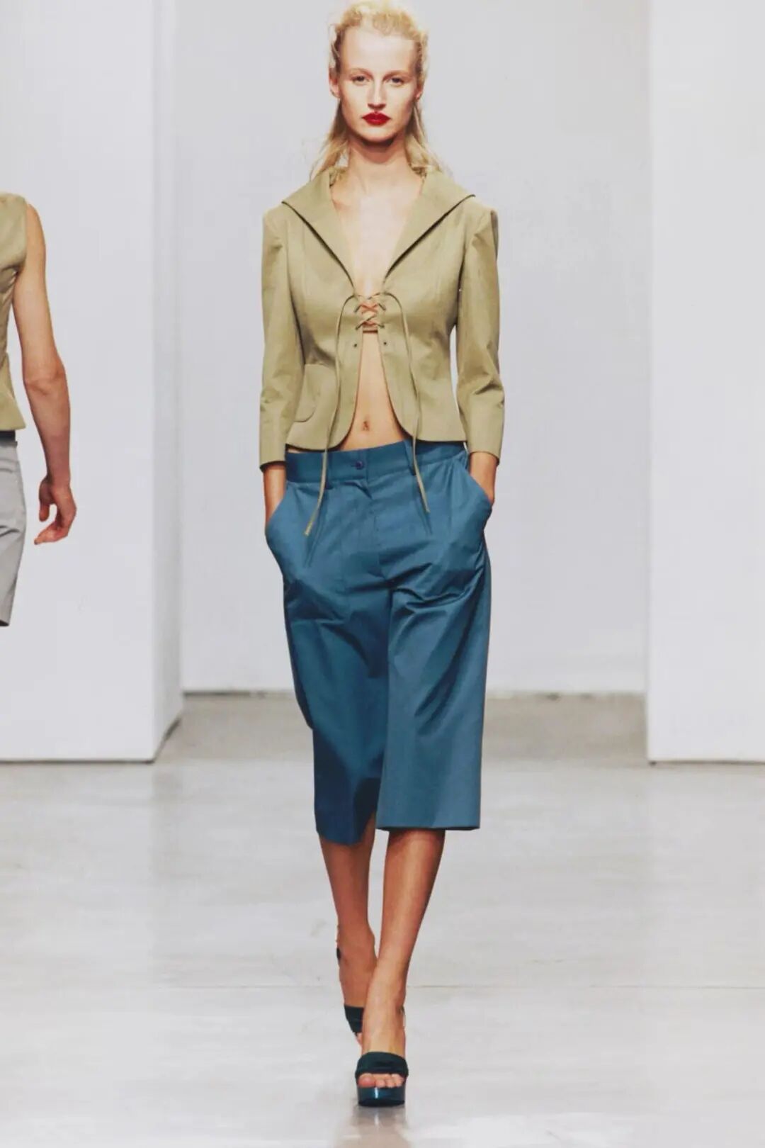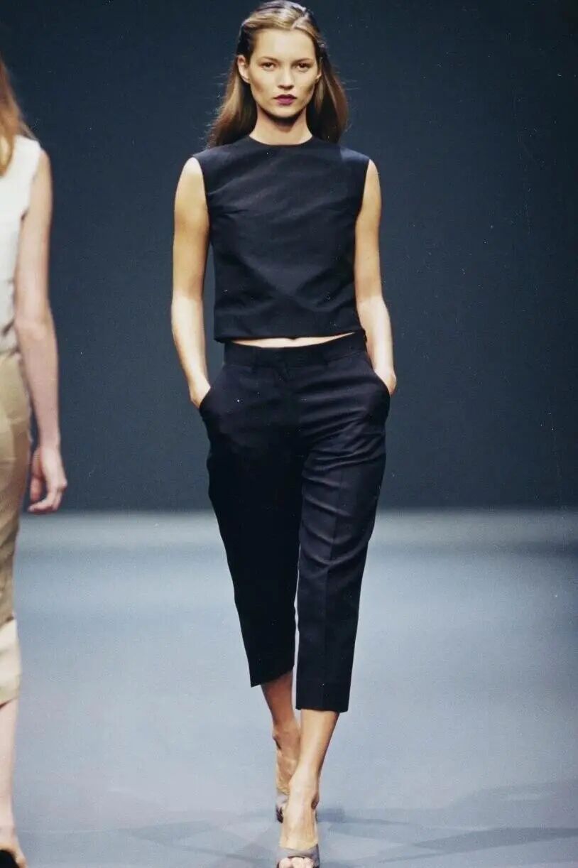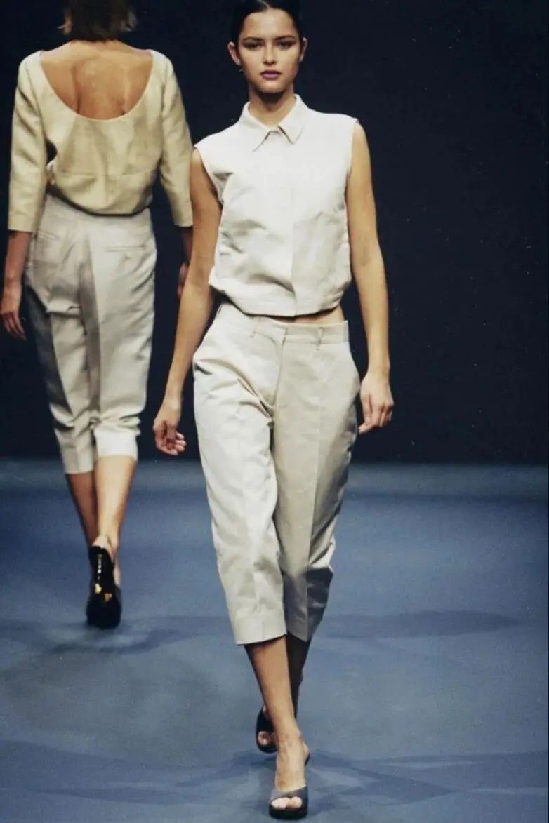 上世纪90年代末,卡普里裤的风潮更是吹到了高级时装秀场上。Prada、MiuMiu等品牌用简约的七分裤型塑造了更加摩登随性的女性形象。