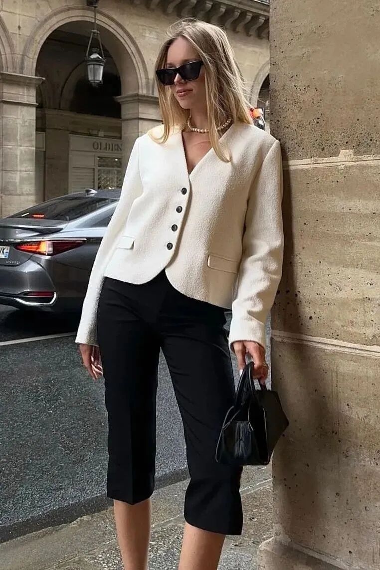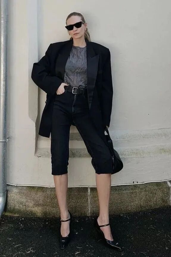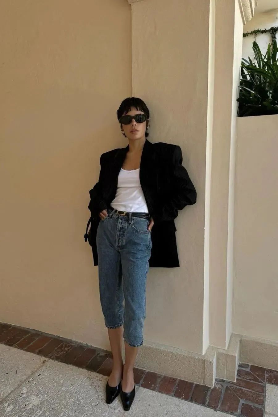 西装裤板型的黑色七分裤还能跟利落的西装外套搭配,平衡休闲与正式的穿搭松弛感满满。