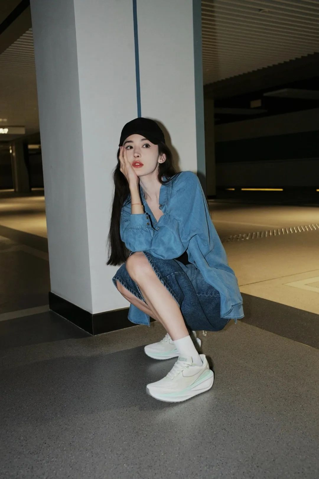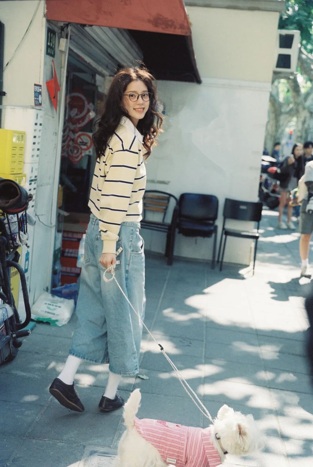 欧阳娜娜一看就很懂七分牛仔裤的氛围感。高腰设计的七分裤搭配浅杏仁色的学院风Polo衫,走在街头仿佛踏入夏日复古滤镜。
