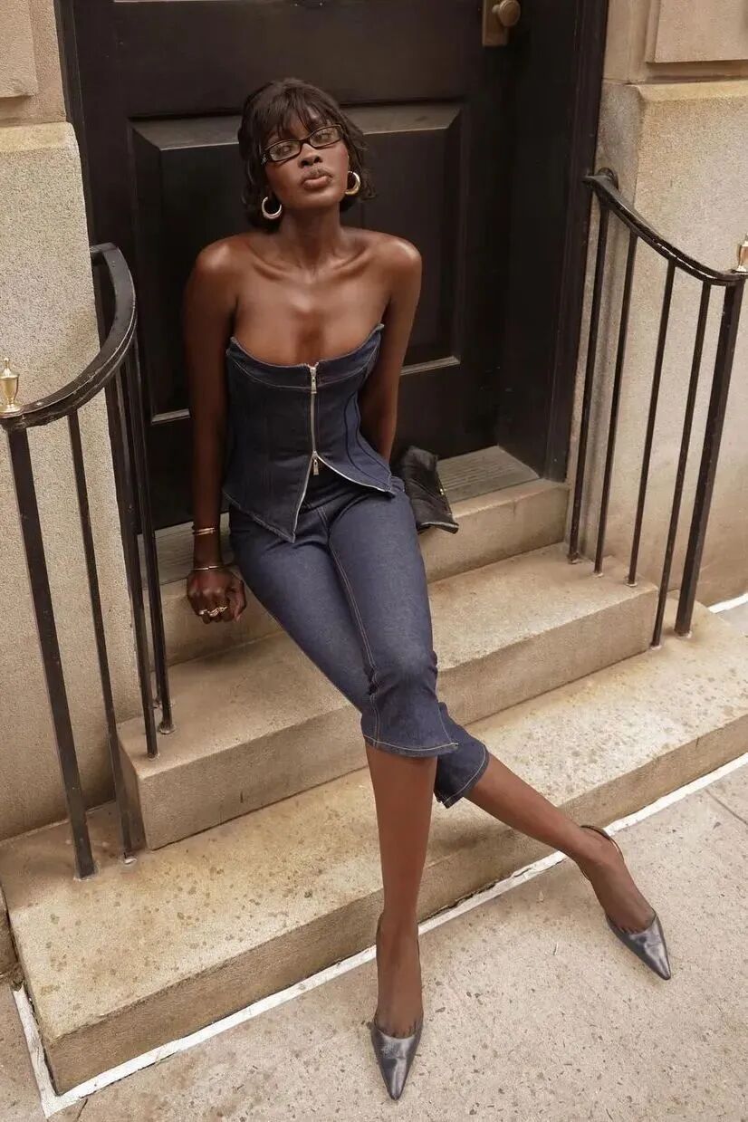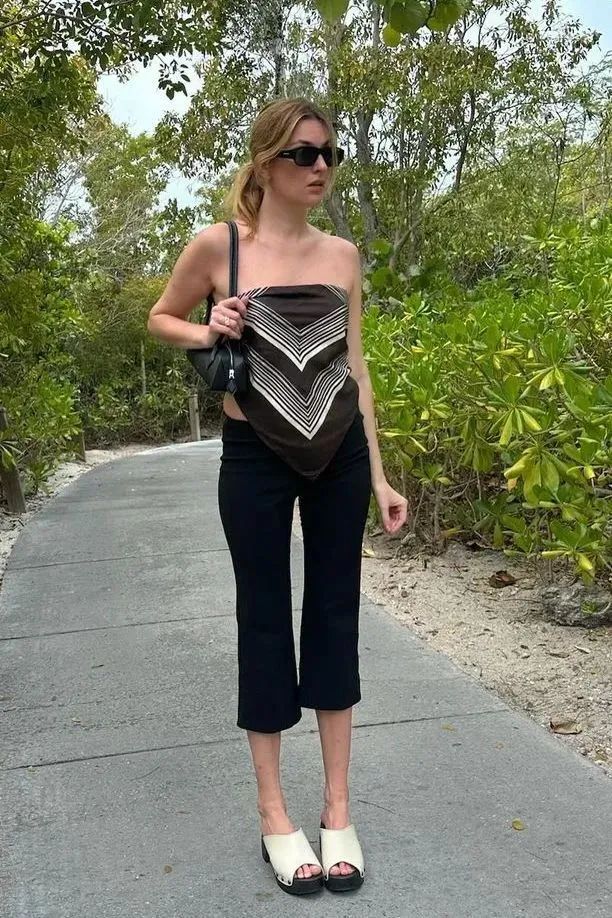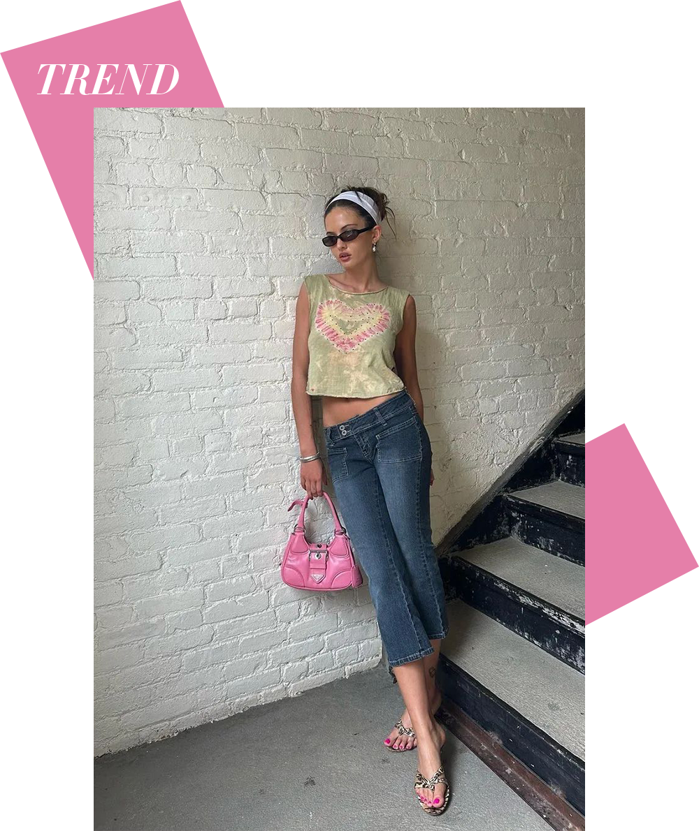 修身七分裤搭配吊带、针织等材质轻薄的短款上衣,高露肤度带来的活力让人一秒回到张扬奔放的千禧年代。