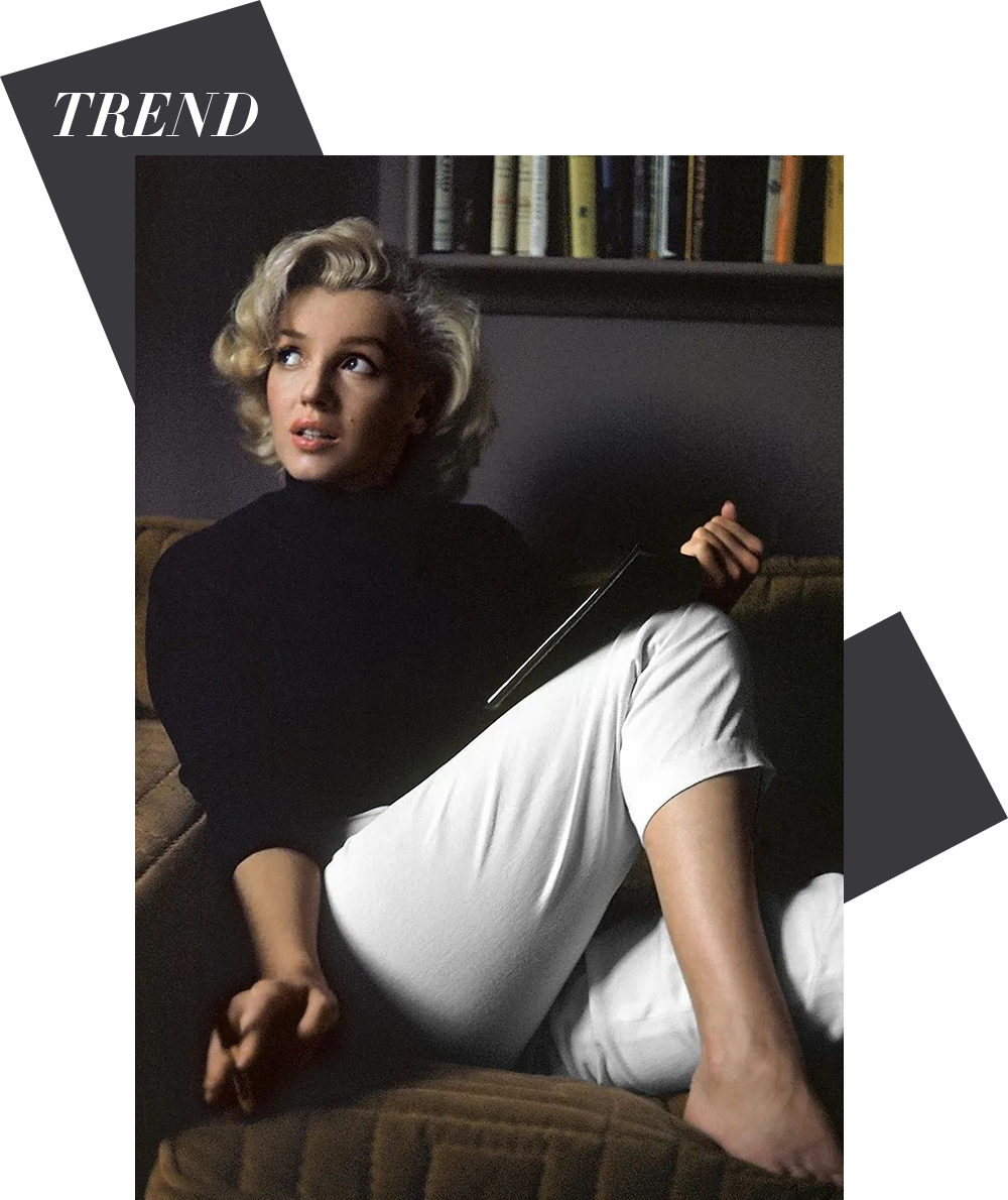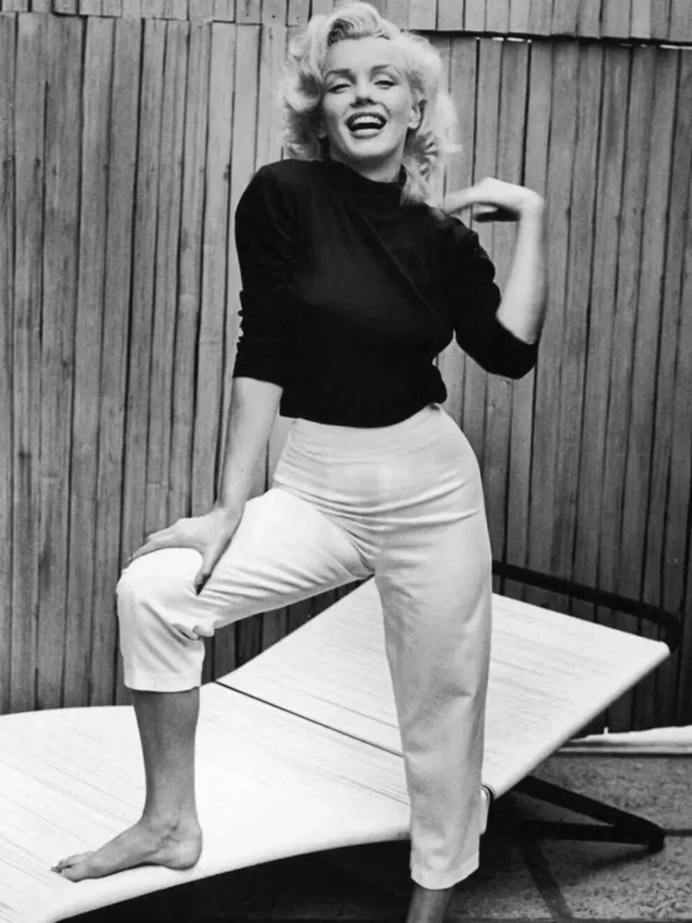 新任“007女郎”Ana de Armas出演的梦露传记电影《金发美人》中,还原了梦露黑色高领衫搭配白色七分裤这一经典造型。