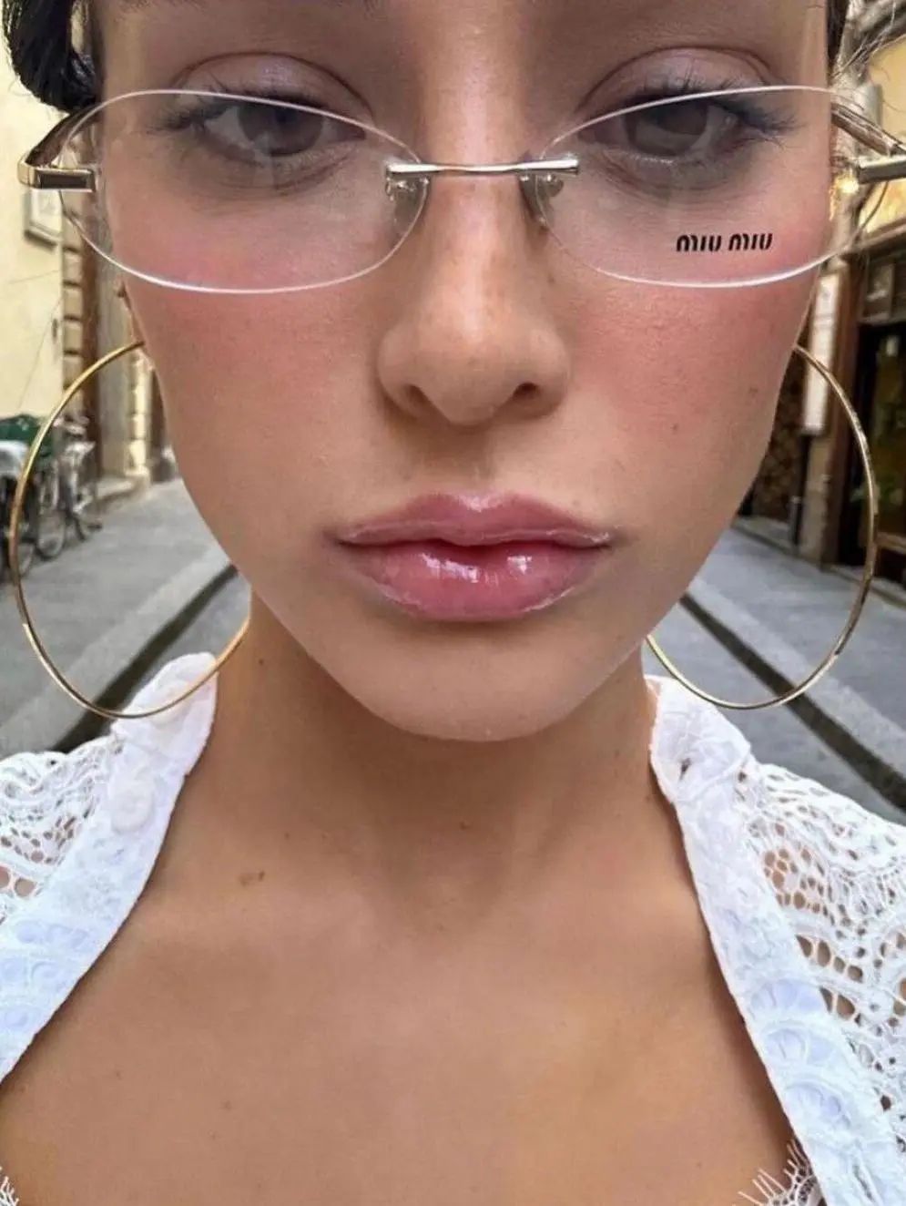 无框眼镜的刻板印象:生人勿近?真相其实是高级感拉满!配上超细的金属鼻托和镜腿,往脸上一架,清爽、利落、讲究的感觉立马就来了。它不像大黑框那么有存在感,也不像金丝边那么复古,它走的是那种“姐很低调,但姐很贵”的路线。