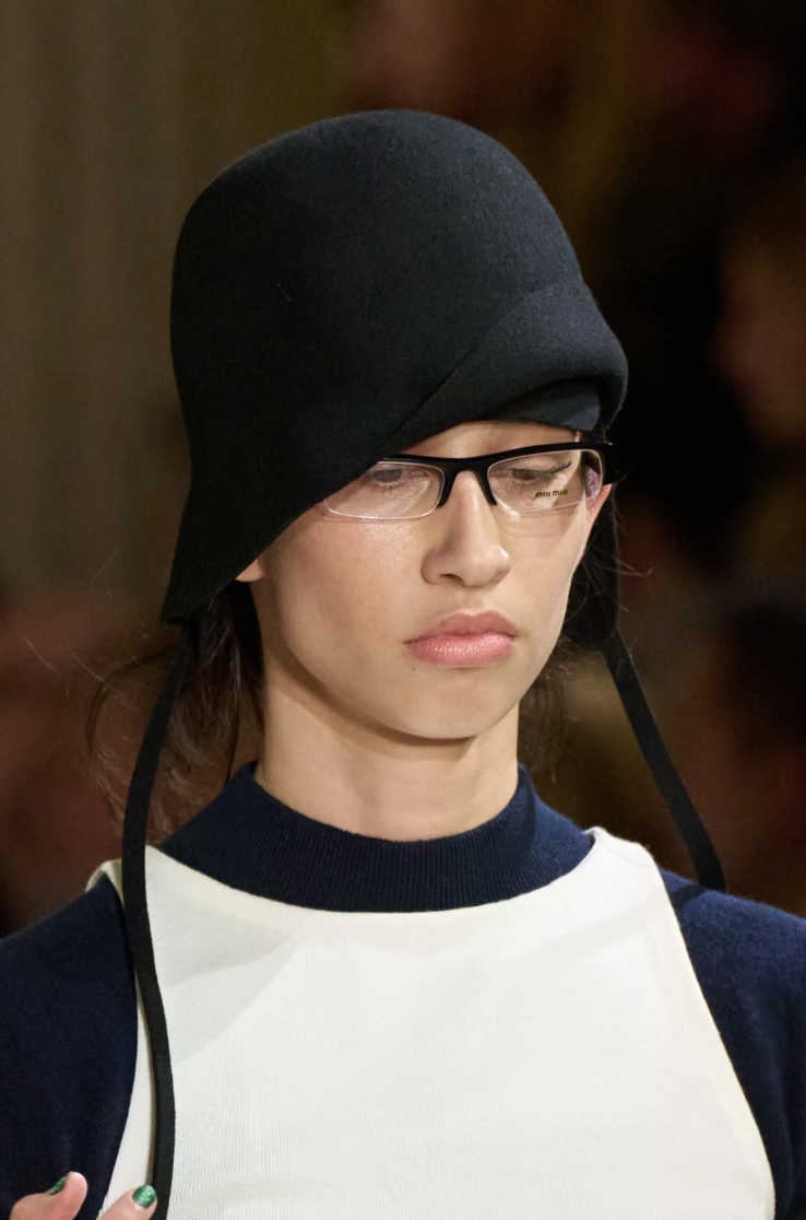 而2025年的Miu Miu也开始精进该风格,你可以看到2025秋冬系列中,眼镜的款式更加复古,更偏向上世纪70年代的感觉。“老气”与“Nerd”只有一线之隔,Miu Miu用超强的造型感让平光镜成为时尚“邪修”的关键一步。