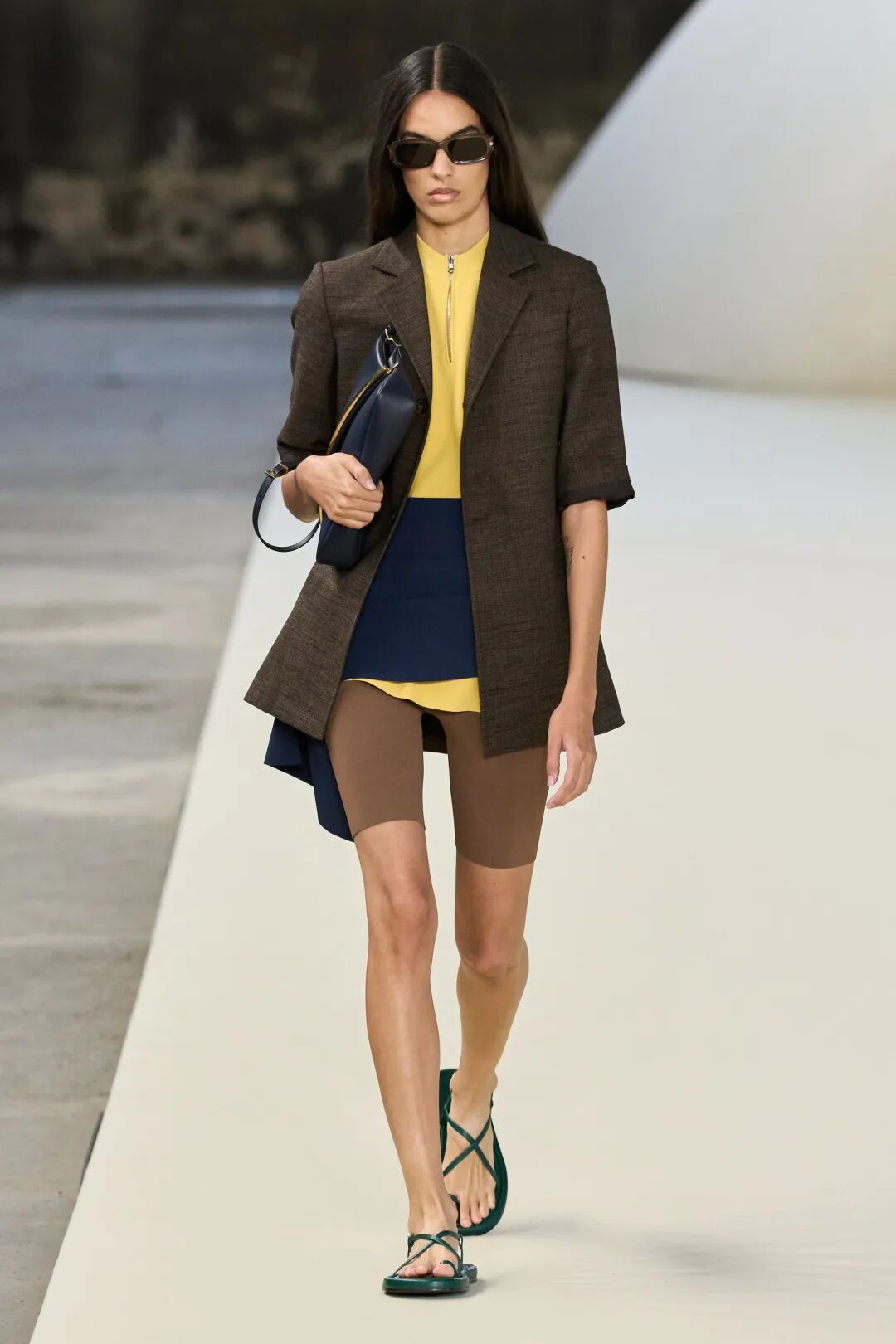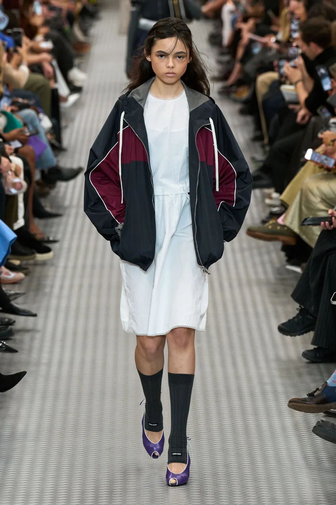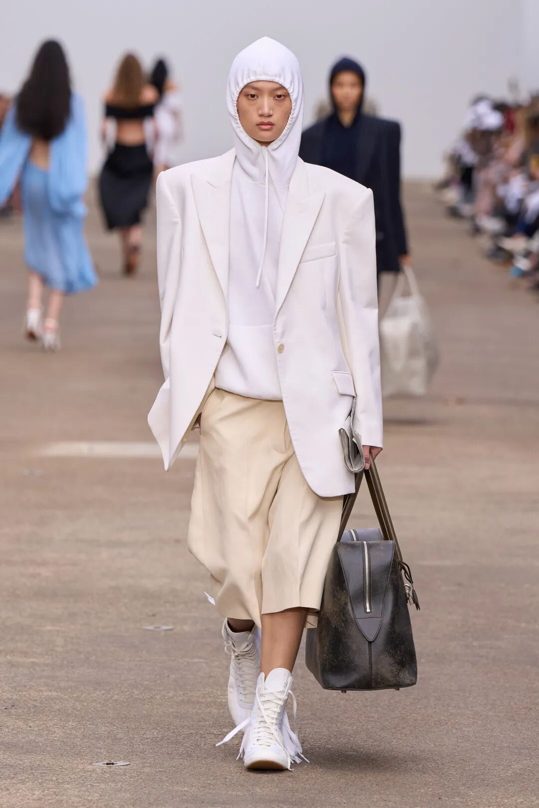 今年,是被官方认证为“体重管理年”的一年,“体重管理”的风终于平等地刮到了每一个人身边。国家从发布《体重管理指导原则》,到提倡各种权威的食谱,身体力行地督促大家健康减重。这种连空气里都弥漫着“健康向上”的氛围,让健身这件事也变得浓度高了起来。健身服也开始走出Gym,走入工位。不知道从什么时候开始,身边同事的衬衫阔腿裤陆续换成了背心瑜伽裤,经历8小时工时后依然有种内啡肽充足的美。前段时间的“办公室海妖风”非常火,但上过班的人都会知道,那是还没踏入职场的人对上班的终极幻想。回到现实中,西装的袖口会影响打字的速度,系扣太紧的腰部和久坐会让小肚子变得更加拥挤,高跟鞋和地铁这两个词更是不能同时出现……真正的上班人,是懂如何把工位变成舒适区的。第一步,先从穿上合适的健身服开始,把每一个KPI当作极限重量,每一份报表就是精神氮泵,莫名其妙燃起来,工作效率也变高了。同时打工人的设计师们深谙上班穿运动装有多舒爽,于是在秀场里也玩起了“轻松上班”的游戏。同时集齐少年气和少女感的Miu Miu在通勤这件事上,也是一如既往的松弛,平底拖鞋、运动Polo衫、onepiece裙这些关键词一出来,就是标准的早八穿搭。Stella McCartney和Tory Burch2025春夏用宽松的运动裤、oversize卫衣和球鞋等元素,把由西装和高跟鞋组成的传统办公室拉入了休闲惬意的氛围。Ferragamo和Tod's 2025春夏则是把芭蕾和瑜伽的曲线带入工作状态,穿成这样,长时间伏案导致的僵硬脊椎仿佛变得更加柔软。