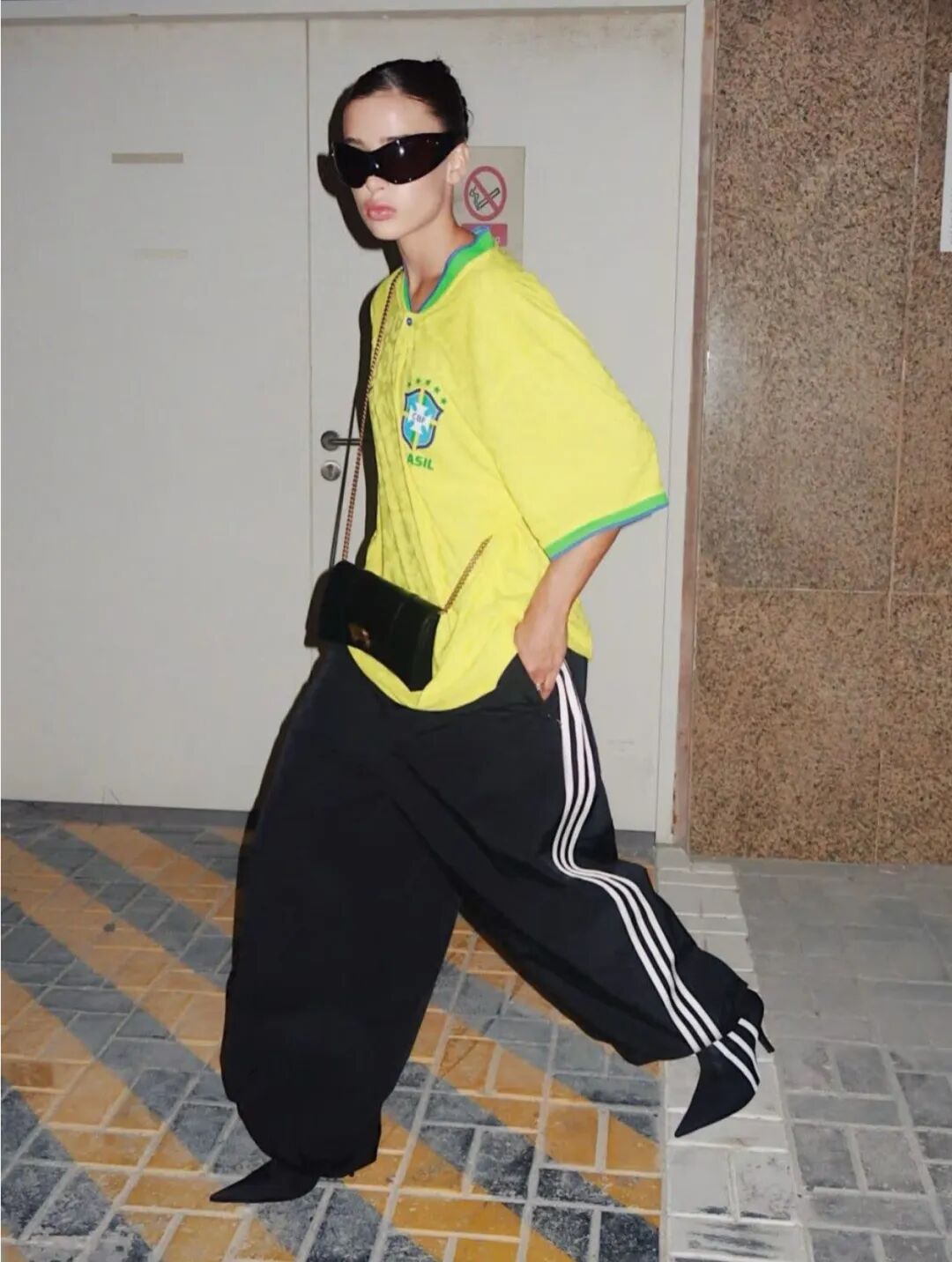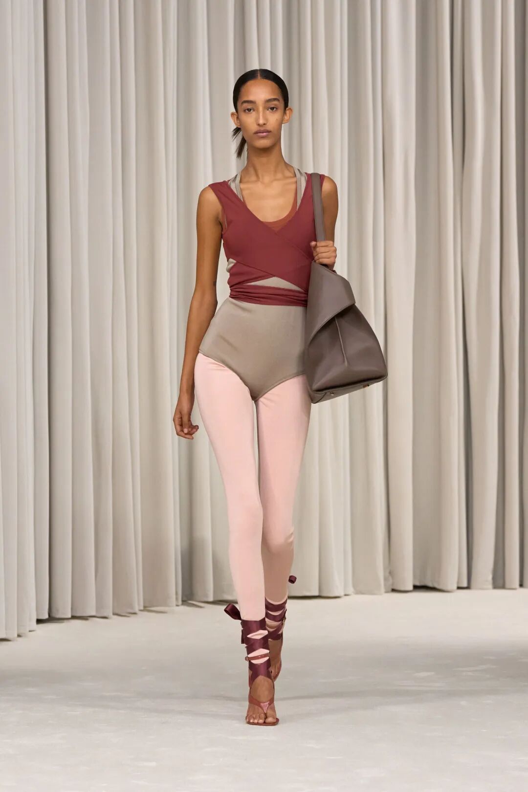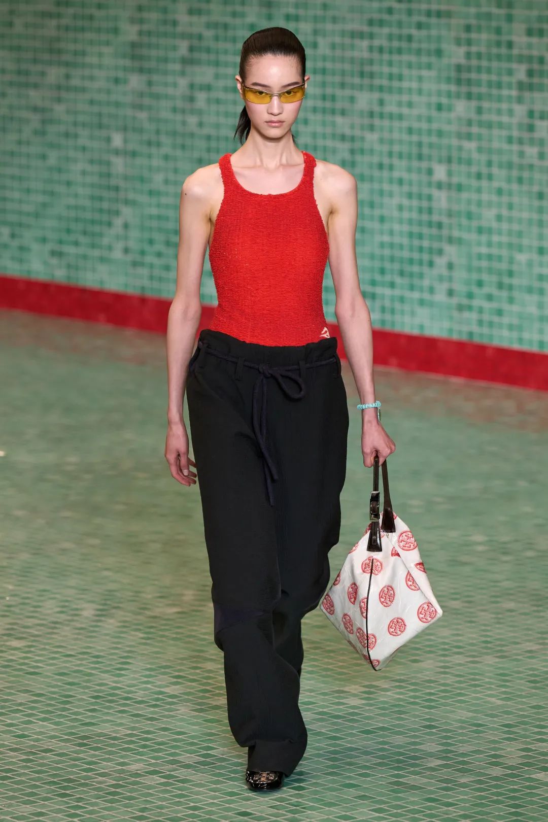 今年,是被官方认证为“体重管理年”的一年,“体重管理”的风终于平等地刮到了每一个人身边。国家从发布《体重管理指导原则》,到提倡各种权威的食谱,身体力行地督促大家健康减重。这种连空气里都弥漫着“健康向上”的氛围,让健身这件事也变得浓度高了起来。健身服也开始走出Gym,走入工位。不知道从什么时候开始,身边同事的衬衫阔腿裤陆续换成了背心瑜伽裤,经历8小时工时后依然有种内啡肽充足的美。前段时间的“办公室海妖风”非常火,但上过班的人都会知道,那是还没踏入职场的人对上班的终极幻想。回到现实中,西装的袖口会影响打字的速度,系扣太紧的腰部和久坐会让小肚子变得更加拥挤,高跟鞋和地铁这两个词更是不能同时出现……真正的上班人,是懂如何把工位变成舒适区的。第一步,先从穿上合适的健身服开始,把每一个KPI当作极限重量,每一份报表就是精神氮泵,莫名其妙燃起来,工作效率也变高了。同时打工人的设计师们深谙上班穿运动装有多舒爽,于是在秀场里也玩起了“轻松上班”的游戏。同时集齐少年气和少女感的Miu Miu在通勤这件事上,也是一如既往的松弛,平底拖鞋、运动Polo衫、onepiece裙这些关键词一出来,就是标准的早八穿搭。Stella McCartney和Tory Burch2025春夏用宽松的运动裤、oversize卫衣和球鞋等元素,把由西装和高跟鞋组成的传统办公室拉入了休闲惬意的氛围。Ferragamo和Tod's 2025春夏则是把芭蕾和瑜伽的曲线带入工作状态,穿成这样,长时间伏案导致的僵硬脊椎仿佛变得更加柔软。