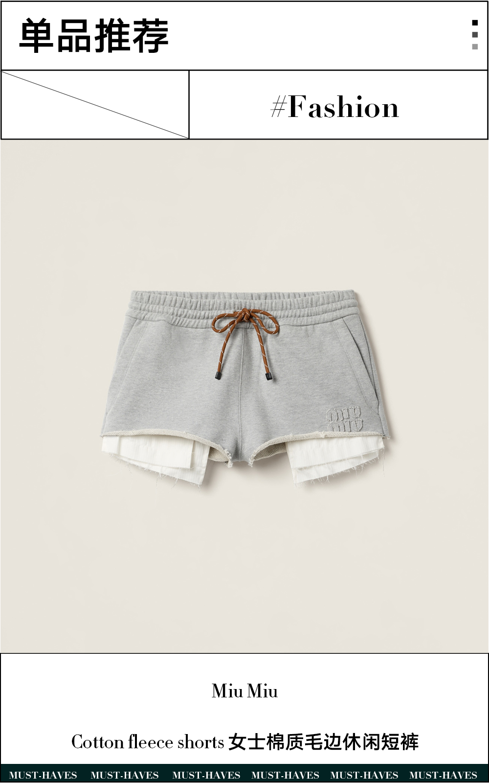 Miu Miu这条棉质羊毛短裤走的就是“随性潮”路线!毛边裤脚自带复古感,柔软面料+松紧腰设计,舒适到可以全天躺平。再加上刺绣Logo的点缀,低调又有范儿,日常出街和居家休闲都能轻松拿捏。