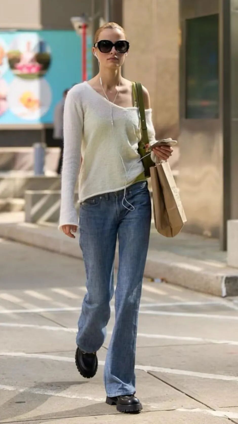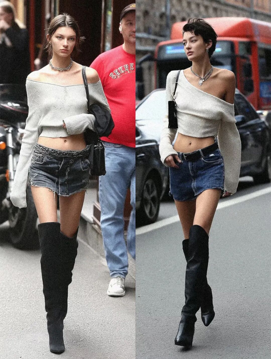 斜肩T恤在日常街头释放出了更为亲密的性感表达。它不再只是设计师作品中的结构想象,而成为都市女孩衣橱中最灵活的“风格语素”——用来修饰情绪、表达态度、调节温度,甚至制造一点点不经意的挑逗。