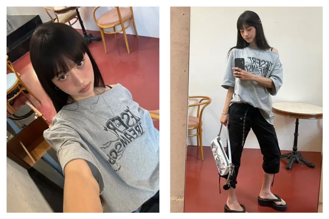 在本季的流行趋势中,斜肩T恤呈现出明显的多样化路径:从基本款纯色棉质T,到融入抽绳、绑带、印字标语的Y2K风格;从宽松廓形的运动感,到搭配柔软针织的法式懒感。