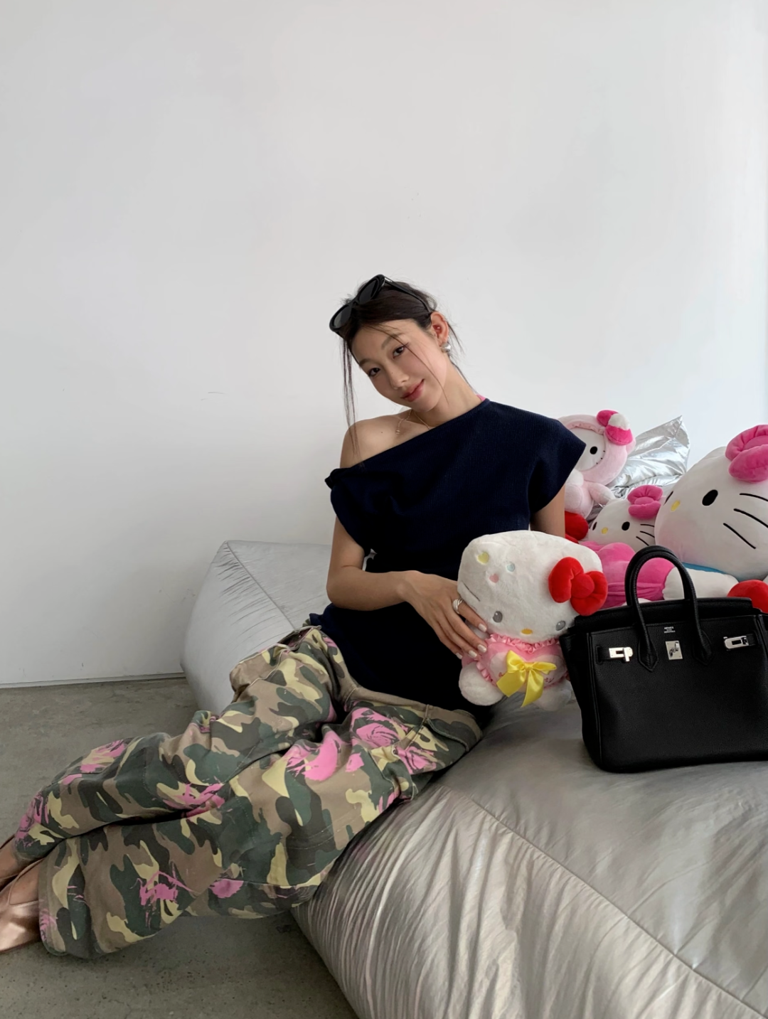街头博主们也赋予斜肩T更多风格公式:一件白色斜肩T,搭配高腰浅色牛仔裤、粗跟穆勒鞋和一条夸张耳环,就是简约而不失时髦的夏日穿搭;而当它与Cargo 工装裤、运动鞋搭配,又立刻转化为率性不羁的City Girl形象。斜肩T恤的真正魅力在于它可甜、可辣、可冷静、可放松,完全取决于穿着者如何“玩”。