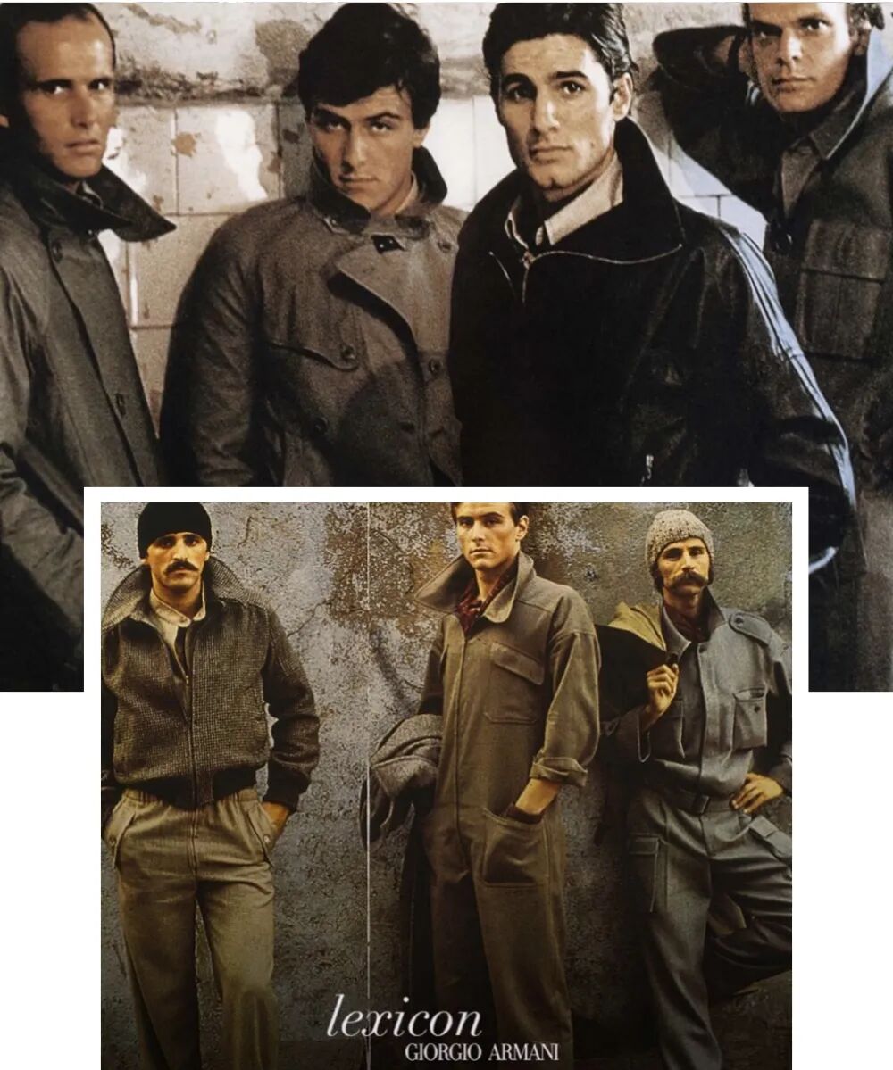 1975年7月,他的首个男装系列在米兰推出。Giorgio Armani以独特的解构思维和中性理念,把运动衣的舒适感和高级正装组合在了一起。软化剪裁、去掉多余的内部结构并放宽西装尺寸,柔和的线条首度出现在正装当中,这在当时无疑是一种颠覆性的举动。Giorgio Armani改变了当时沉闷僵硬的男性形象,率先在男士时装领域发起了一场新变革。